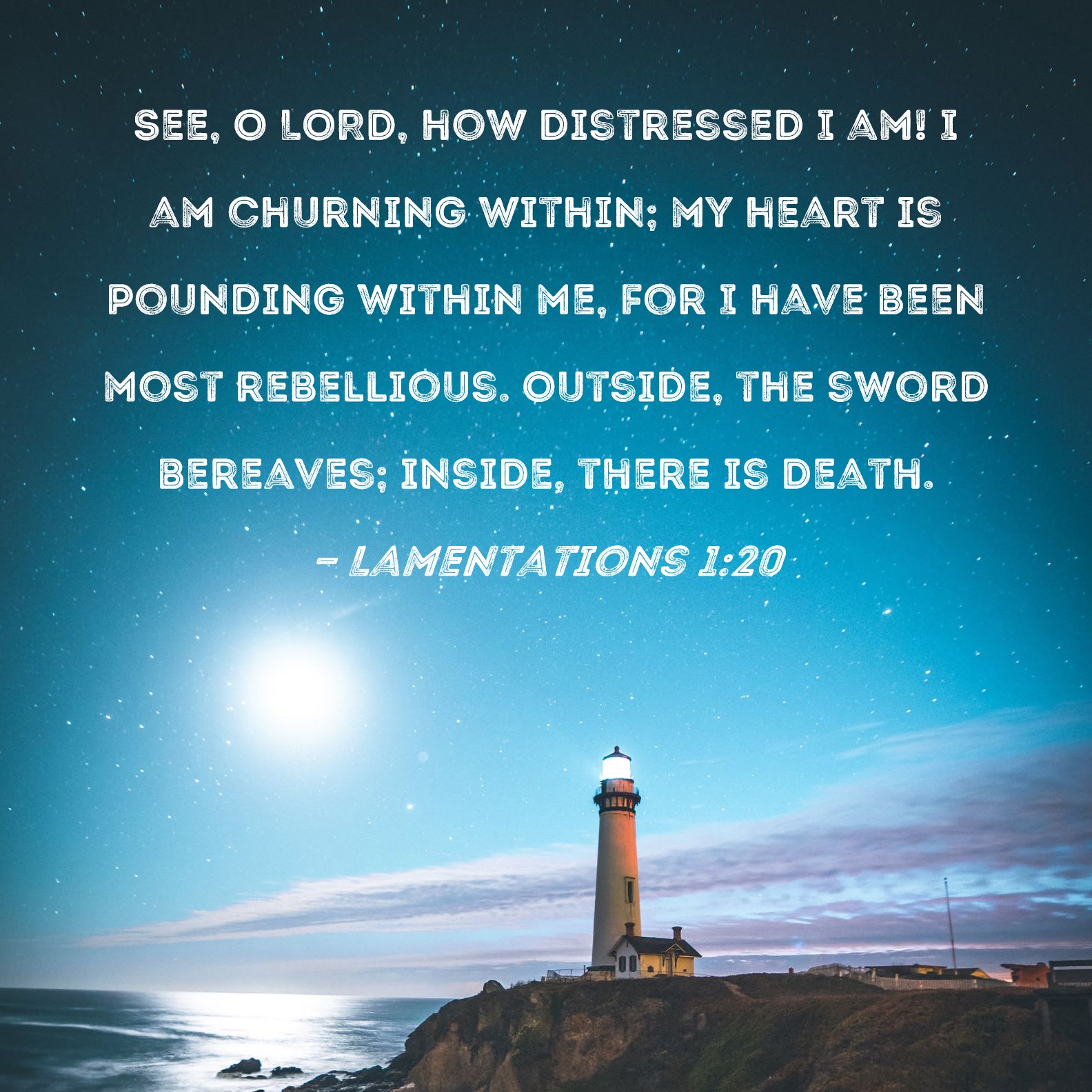Lamentations 1:20 See, O LORD, how distressed I am! I am churning within; my heart is pounding within me, for I have been most rebellious. Outside, the sword bereaves; inside, there is death.