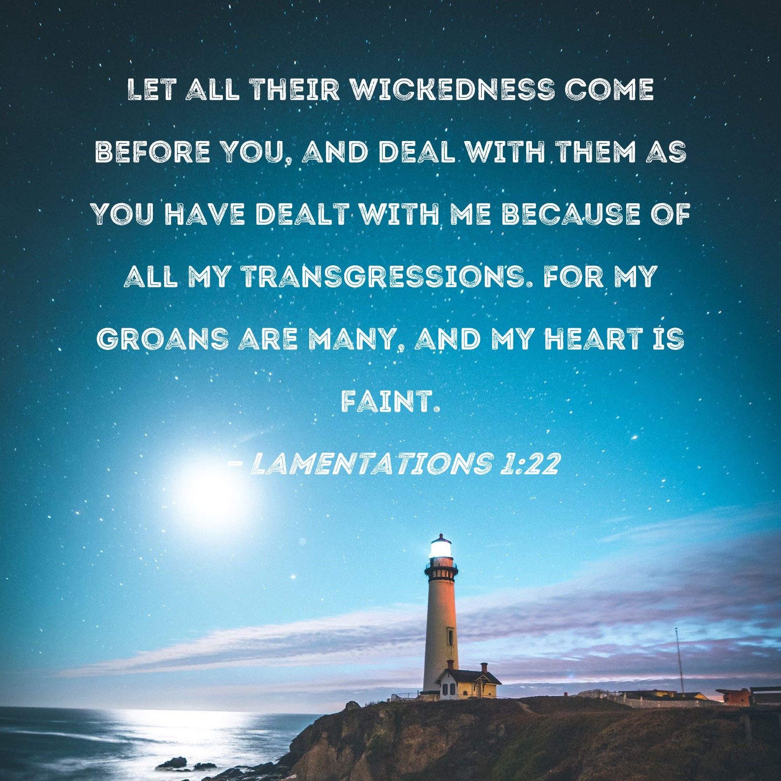 Lamentations 1:22 Let all their wickedness come before You, and deal with them as You have dealt with me because of all my transgressions. For my groans are many, and my heart is faint.