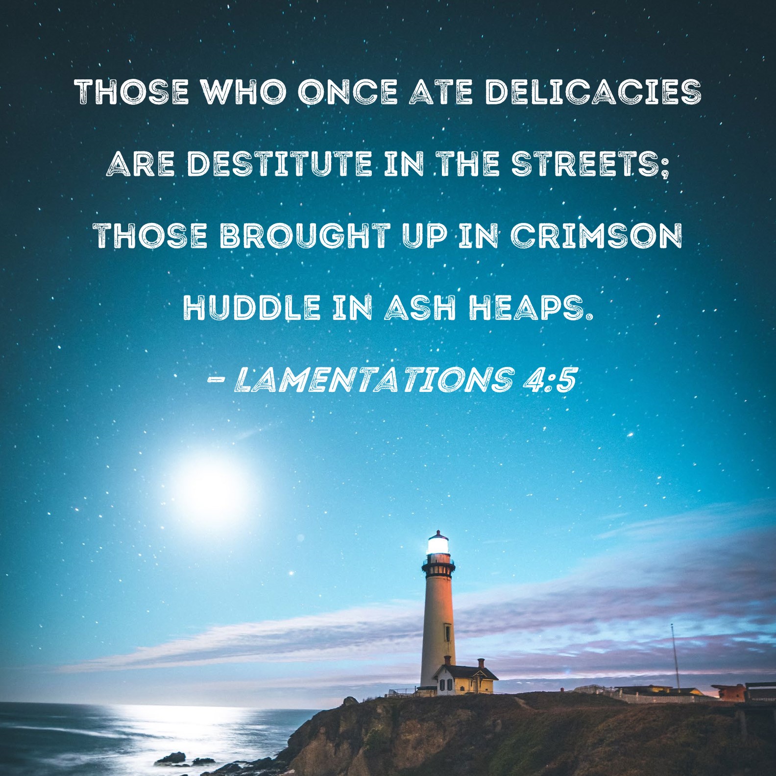Lamentations 4:5 Those who once ate delicacies are destitute in the streets; those brought up in crimson huddle in ash heaps.
