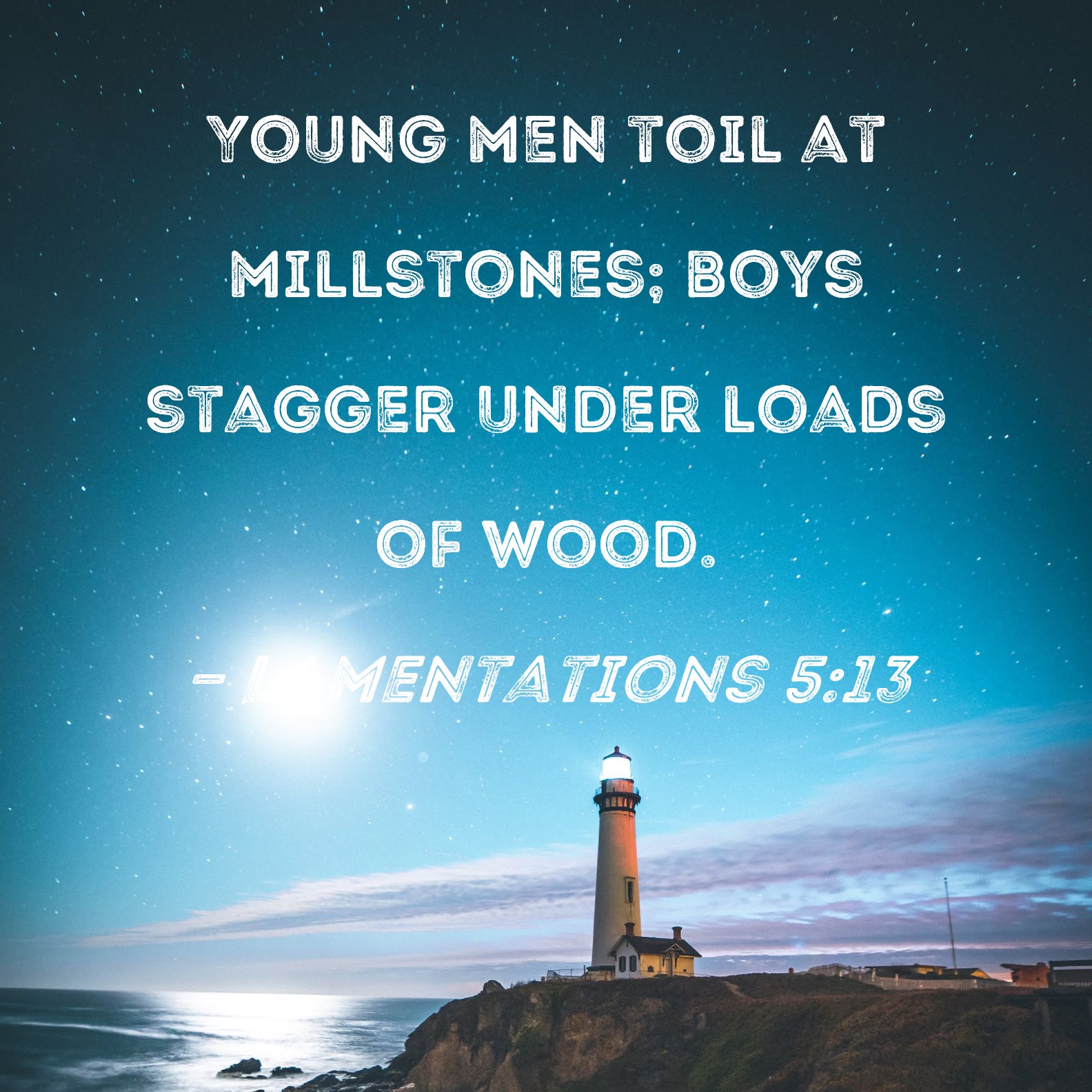 Lamentations 5:13 Young men toil at millstones; boys stagger under loads of wood.