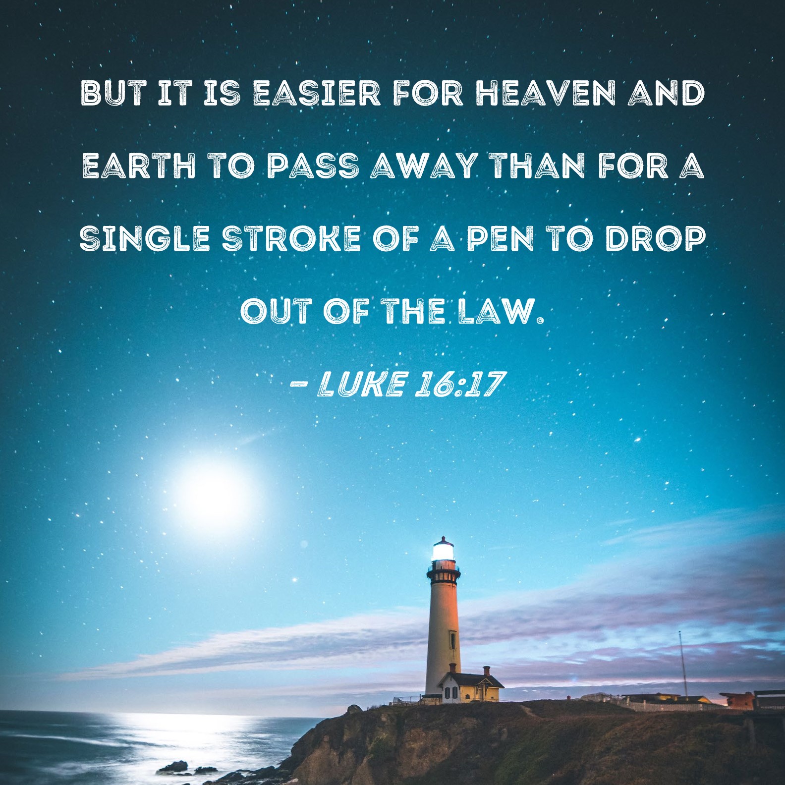 Luke 16:17 But it is easier for heaven and earth to pass away than for a single stroke of a pen to drop out of the Law.