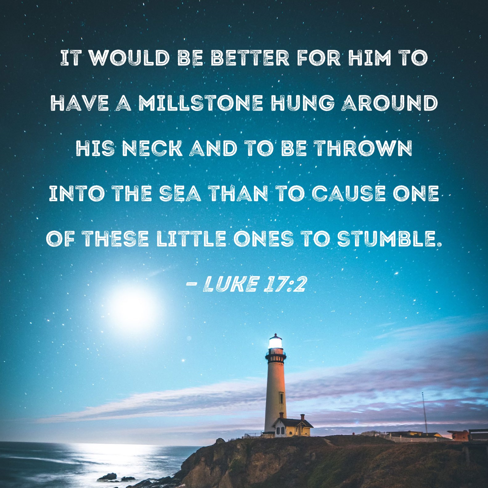 Luke 17:2 It would be better for him to have a millstone hung around his neck and to be thrown into the sea than to cause one of these little ones to stumble.