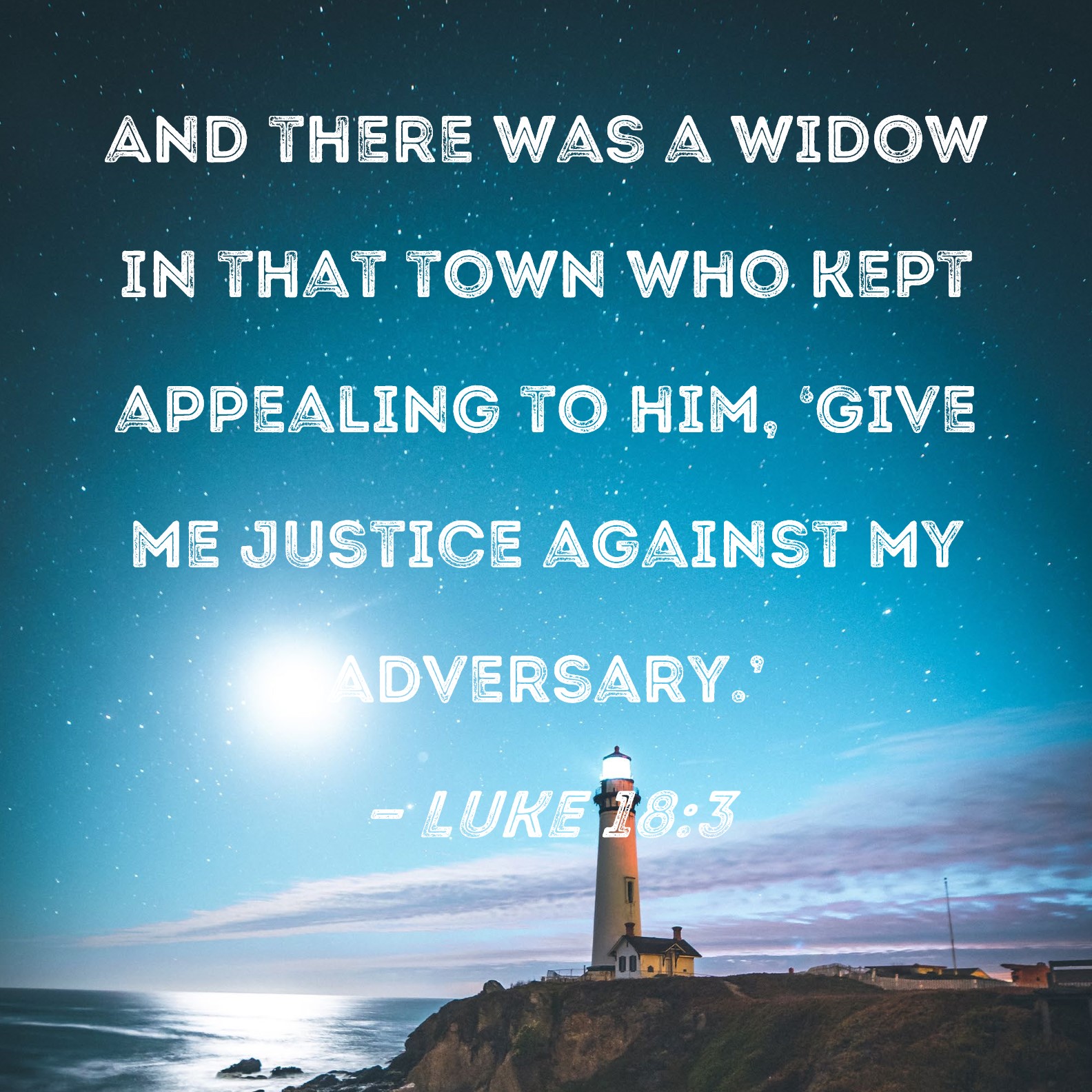 Luke 18:3 And there was a widow in that town who kept appealing to him, 'Give me justice against my adversary.'