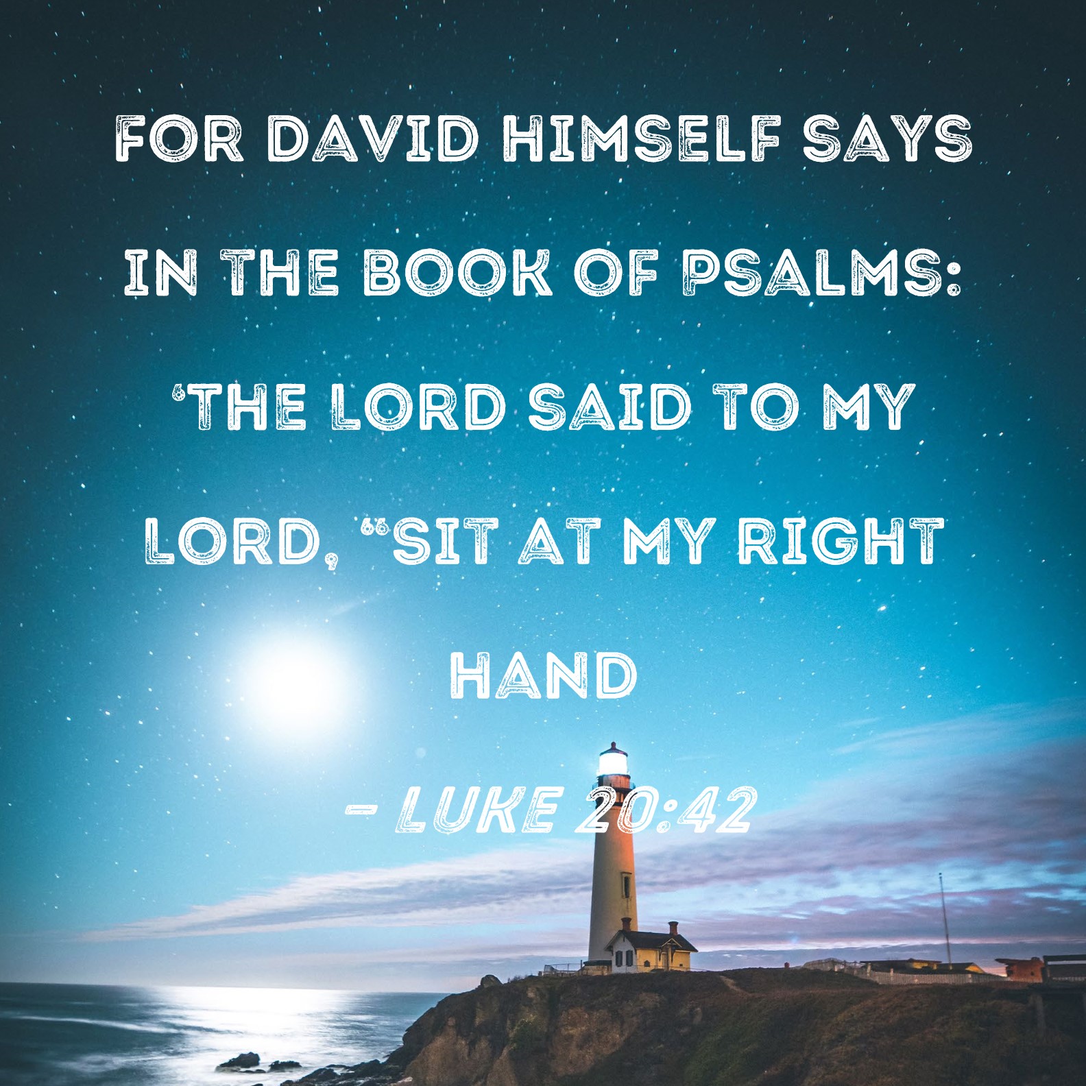 BSB: For David himself says in the book of Psalms: 'The Lord said to my Lord, "Sit at My right hand KJV: And David himself saith in the book of Psalms, The LORD said unto my Lord, Sit thou on my right hand, DRB: And David himself saith in the book of Psalms: The Lord said to my Lord, sit thou on my right hand, DBT: and David himself says in the book of Psalms, The Lord said to my Lord, Sit at my right hand ERV: For David himself saith in the book of Psalms, The Lord said unto my Lord, Sit thou on my right hand, WBT: And David himself saith in the book of Psalms, The LORD said to my Lord, Sit thou on my right hand, WEB: David himself says in the book of Psalms, ‘The Lord said to my Lord, “Sit at my right hand, YLT: and David himself saith in the Book of Psalms, The Lord said to my lord, Sit thou on my right hand,Links Luke 20:42 NIV • Luke 20:42 NLT • Luke 20:42 ESV • Luke 20:42 NASB • Luke 20:42 KJV • Luke 20:42 Interlinear • Luke 20:42 Commentaries • Luke 20:42 Parallel Texts • Luke 20:42 Bible Apps • Luke 20:42 Parallel • Bible Hub |