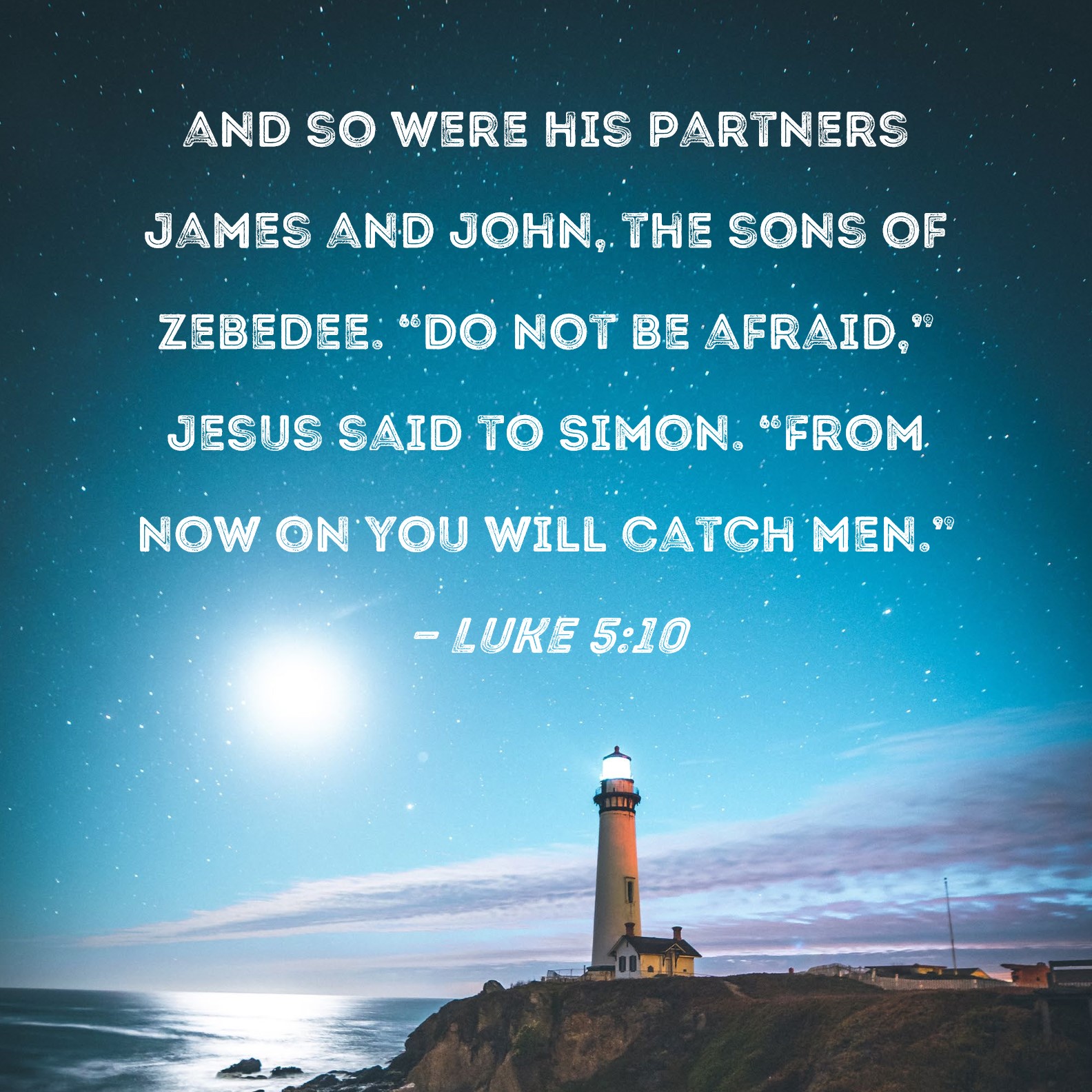 Luke 5:10 and so were his partners James and John, the sons of Zebedee. "Do not be afraid," Jesus said to Simon. "From now on you will catch men."