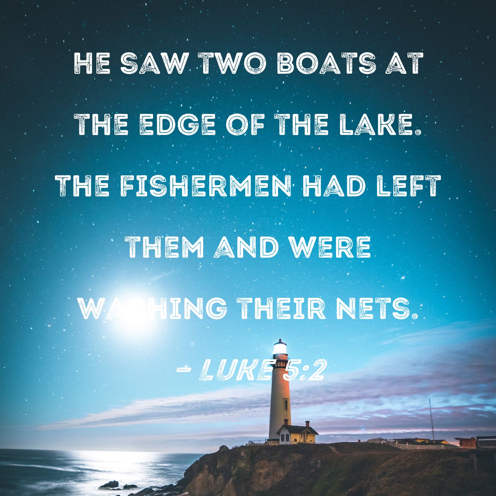 BSB: He saw two boats at the edge of the lake. The fishermen had left them and were washing their nets. KJV: And saw two ships standing by the lake: but the fishermen were gone out of them, and were washing their nets. DRB: And saw two ships standing by the lake: but the fishermen were gone out of them, and were washing their nets. DBT: and he saw two ships standing by the lake, but the fishermen, having come down from them, were washing their nets. ERV: and he saw two boats standing by the lake: but the fishermen had gone out of them, and were washing their nets. WBT: And saw two boats standing by the lake: but the fishermen had gone out of them, and were washing their nets. WEB: He saw two boats standing by the lake, but the fishermen had gone out of them and were washing their nets. YLT: and he saw two boats standing beside the lake, and the fishers, having gone away from them, were washing the nets,Links Luke 5:2 NIV • Luke 5:2 NLT • Luke 5:2 ESV • Luke 5:2 NASB • Luke 5:2 KJV • Luke 5:2 Interlinear • Luke 5:2 Commentaries • Luke 5:2 Parallel Texts • Luke 5:2 Bible Apps • Luke 5:2 Parallel • Bible Hub |