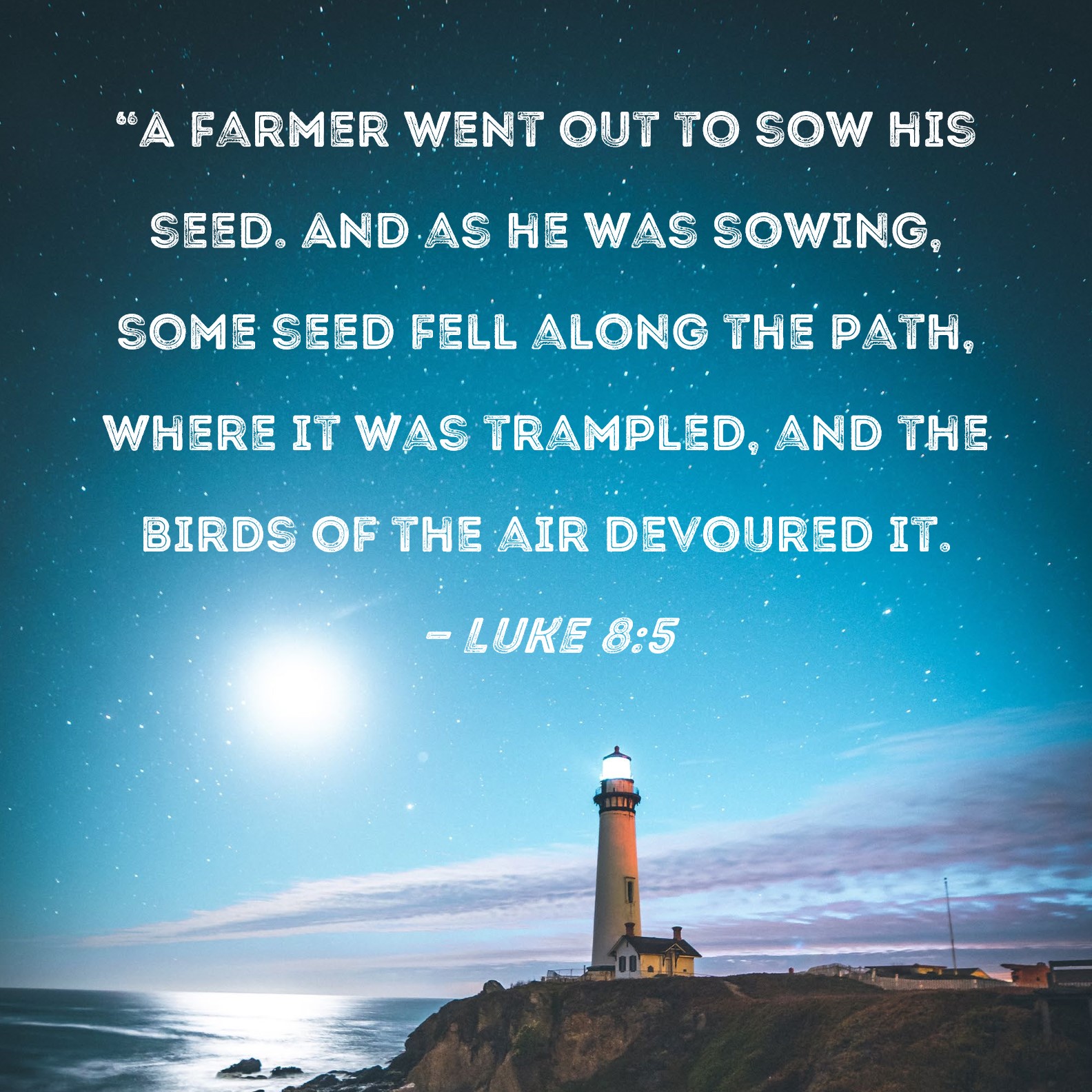 Luke 8:5 "A farmer went out to sow his seed. And as he was sowing, some seed fell along the path, where it was trampled, and the birds of the air devoured it.