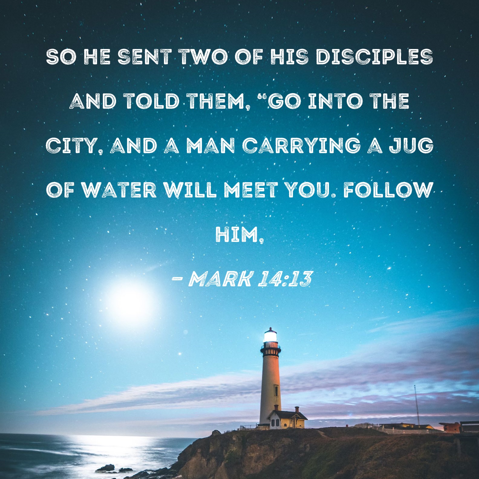 Mark 14:13 So He sent two of His disciples and told them, "Go into the city, and a man carrying a jug of water will meet you. Follow him,
