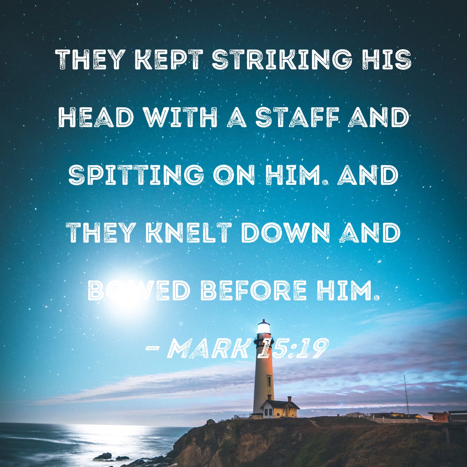 Mark 15:19 They kept striking His head with a staff and spitting on Him. And they knelt down and bowed before Him.