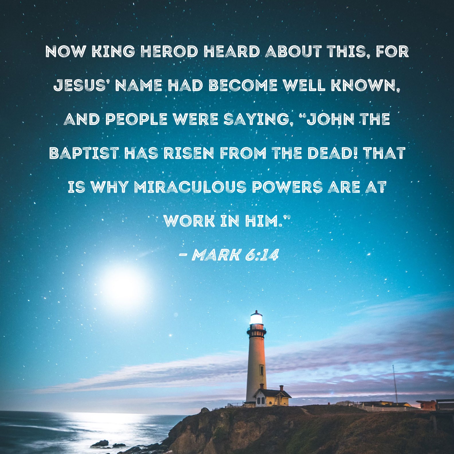 Mark 6:14 Now King Herod heard about this, for Jesus' name had become well known, and people were saying, "John the Baptist has risen from the dead! That is why miraculous powers are at work in him."