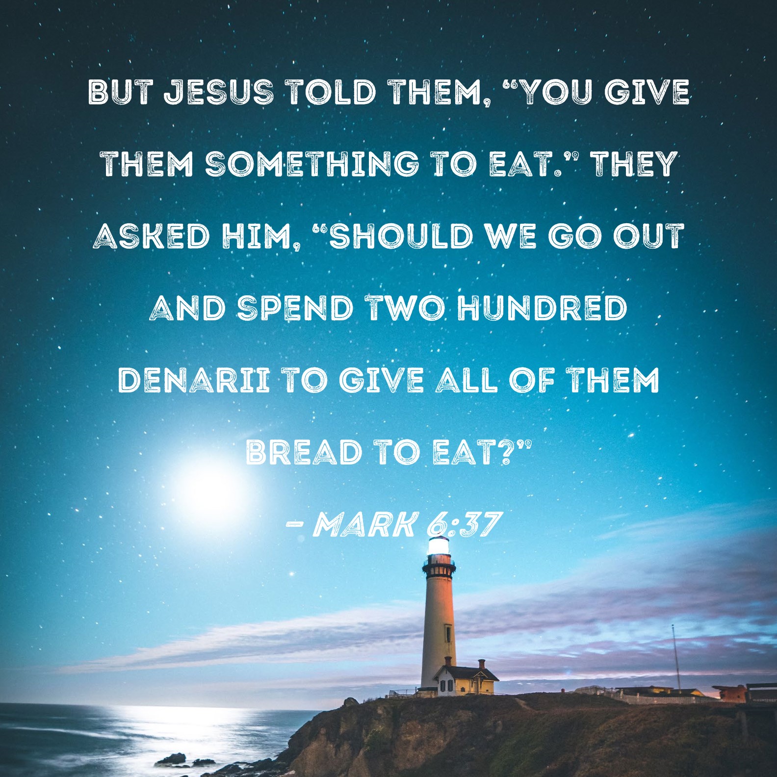 Mark 6:37 But Jesus told them, "You give them something to eat." They asked Him, "Should we go out and spend two hundred denarii to give all of them bread to eat?"