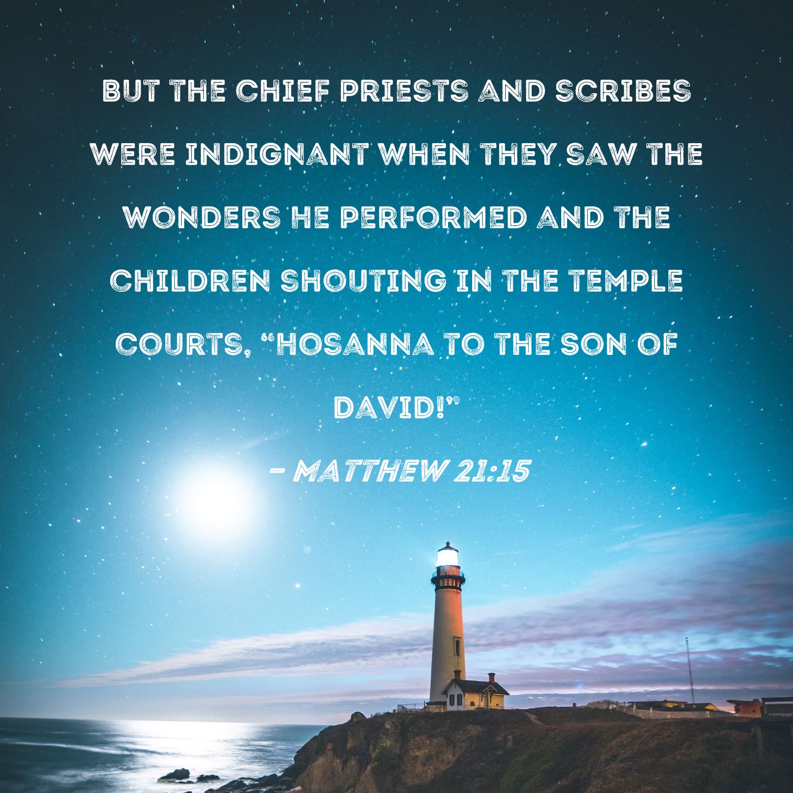 Matthew 21:15 But the chief priests and scribes were indignant when they saw the wonders He performed and the children shouting in the temple courts, "Hosanna to the Son of David!"
