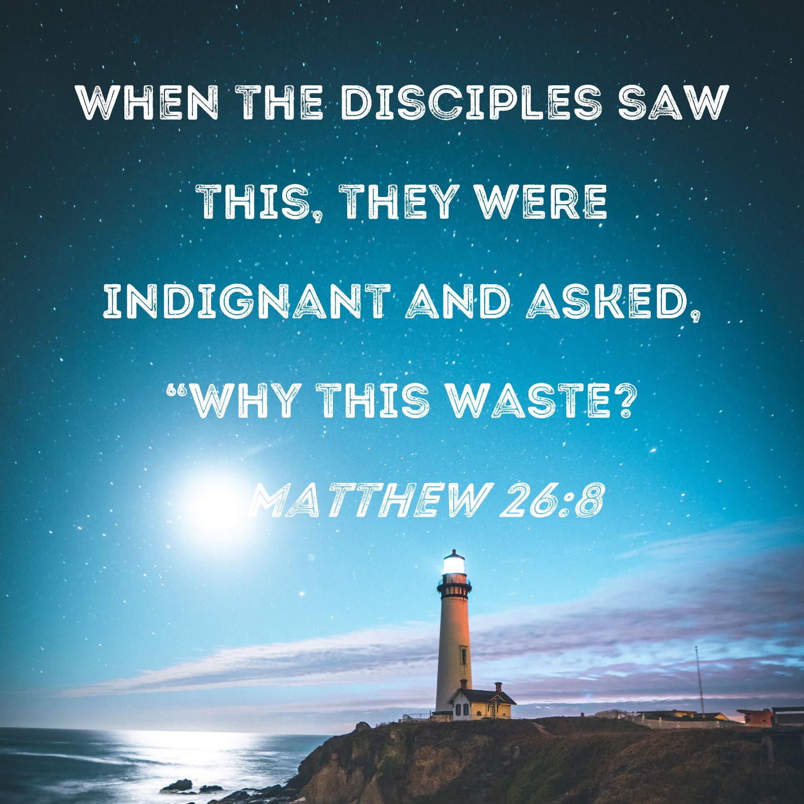 Matthew 26:8 When the disciples saw this, they were indignant and asked, "Why this waste?