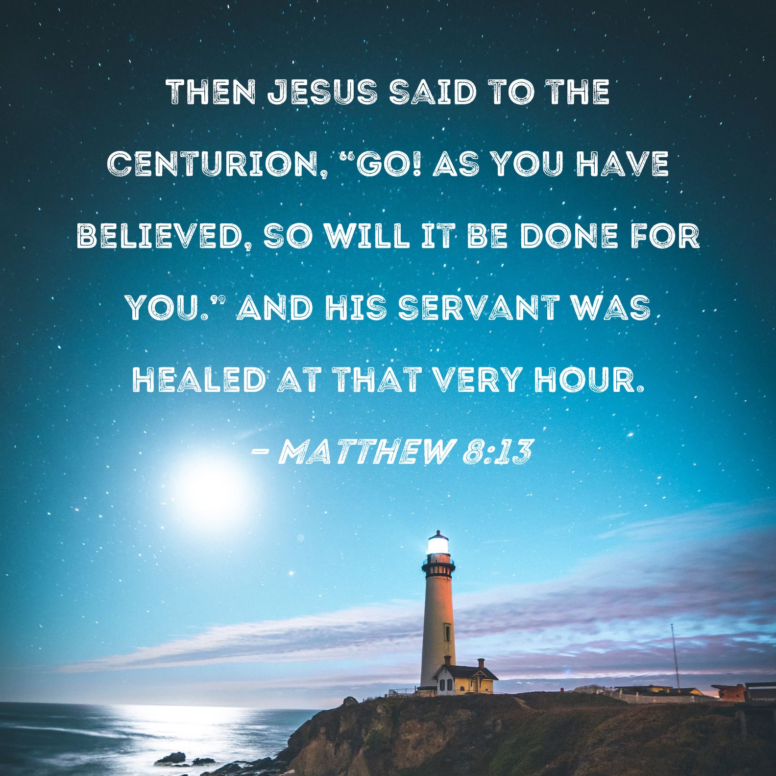 Matthew 8:13 Then Jesus said to the centurion, "Go! As you have believed, so will it be done for you." And his servant was healed at that very hour.