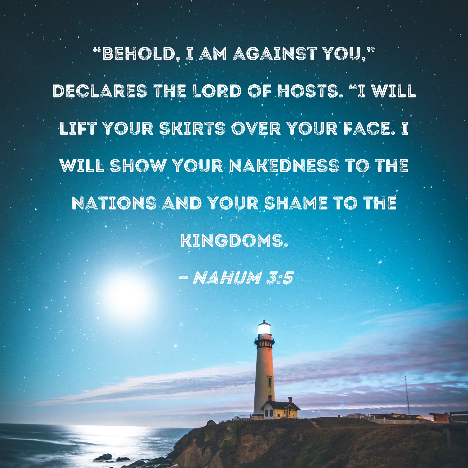 Nahum 3:5 "Behold, I am against you," declares the LORD of Hosts. "I will lift your skirts over your face. I will show your nakedness to the nations and your shame to the kingdoms.