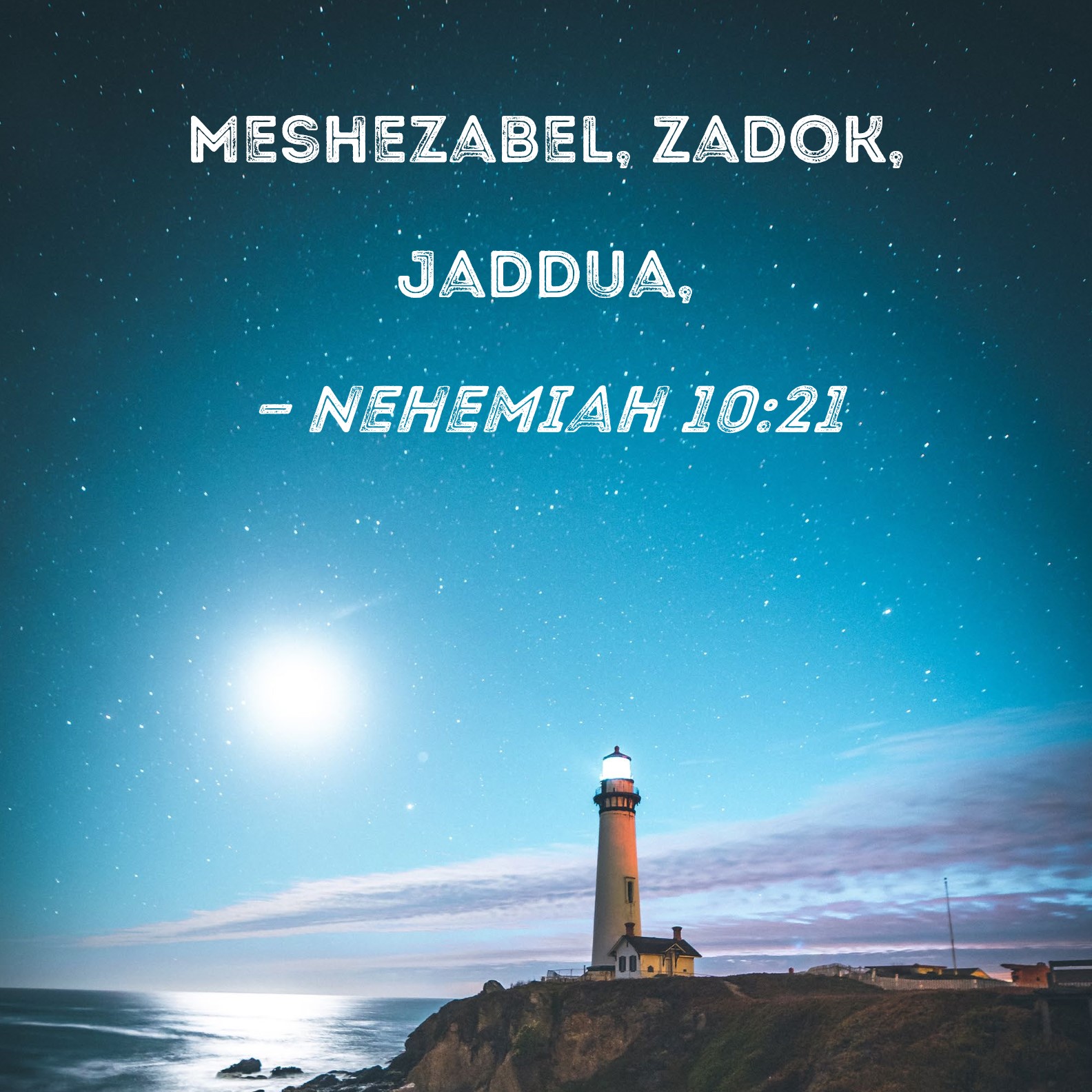 BSB: Meshezabel, Zadok, Jaddua, KJV: Meshezabeel, Zadok, Jaddua, DRB: Mesizabel, Sadoc, Jeddua, DBT: Meshezabeel, Zadok, Jaddua, ERV: Meshezabel, Zadok, Jaddua; WBT: Meshezabeel, Zadok, Jaddua, WEB: Meshezabel, Zadok, Jaddua, YLT: Meshezabeel, Zadok, Jaddua,Links Nehemiah 10:21 NIV • Nehemiah 10:21 NLT • Nehemiah 10:21 ESV • Nehemiah 10:21 NASB • Nehemiah 10:21 KJV • Nehemiah 10:21 Interlinear • Nehemiah 10:21 Commentaries • Nehemiah 10:21 Parallel Texts • Nehemiah 10:21 Bible Apps • Nehemiah 10:21 Parallel • Bible Hub |