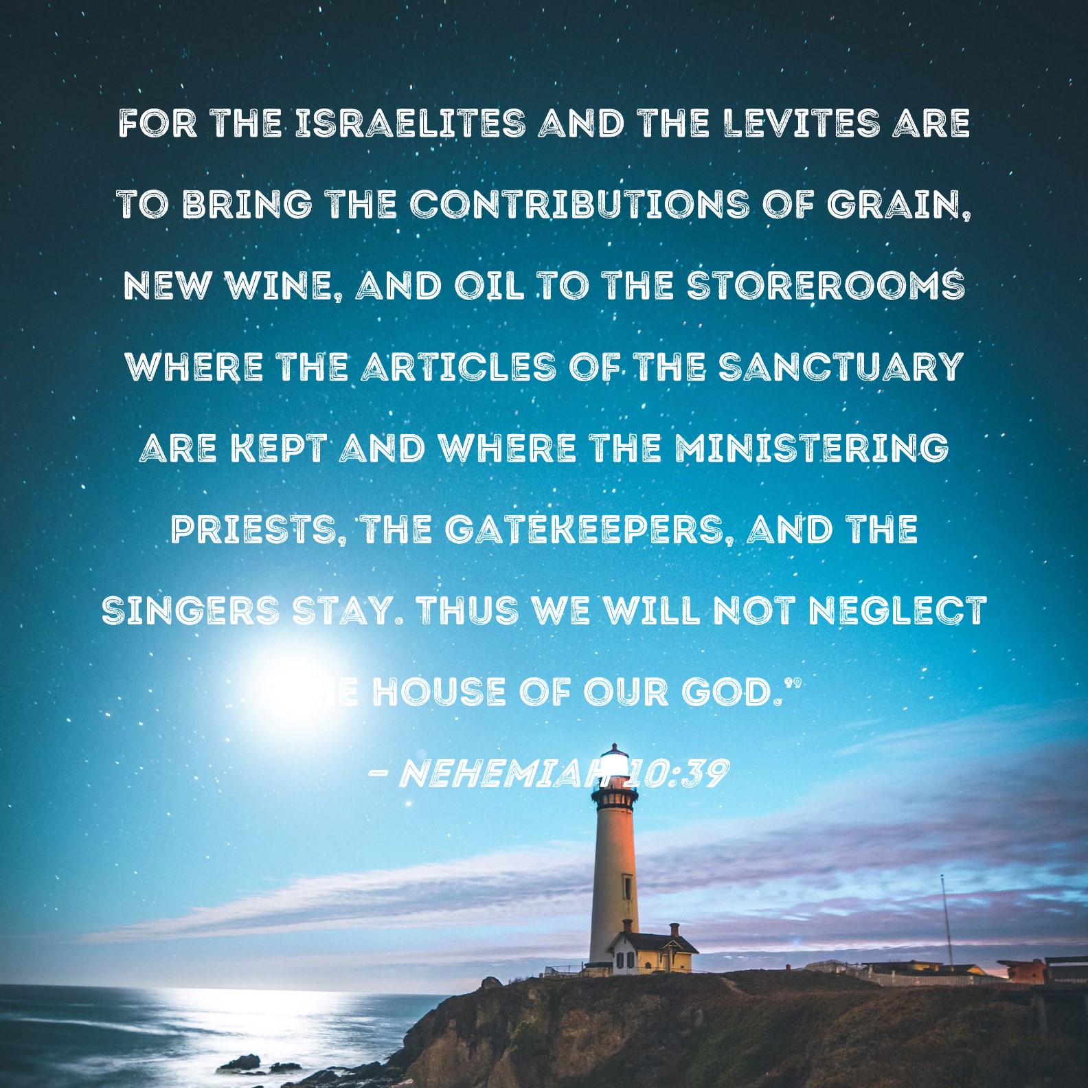 Nehemiah 10:39 For the Israelites and the Levites are to bring the contributions of grain, new wine, and oil to the storerooms where the articles of the sanctuary are kept and where the ministering priests, the gatekeepers, and the singers stay. Thus we will not neglect the house of our God."