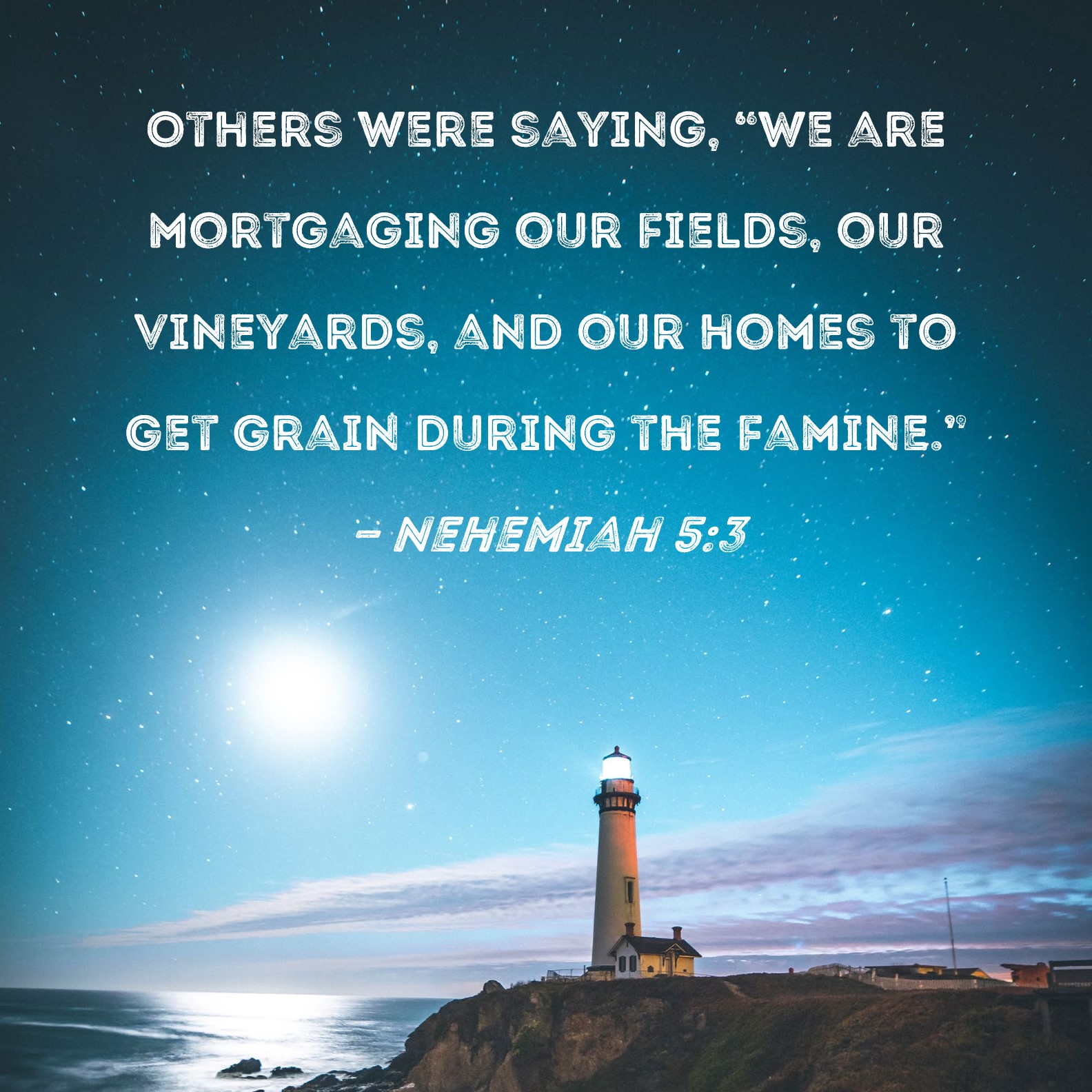 Nehemiah 5:3 Others were saying, "We are mortgaging our fields, our vineyards, and our homes to get grain during the famine."