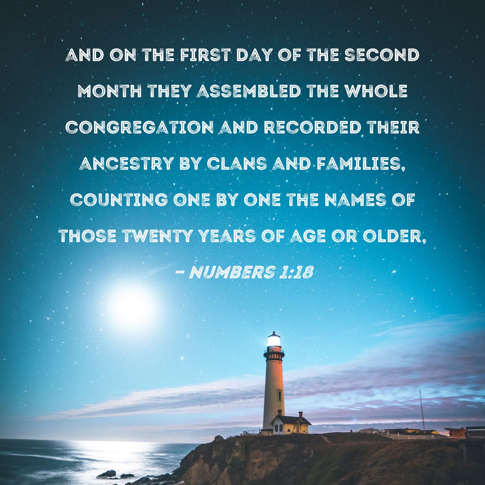 Numbers 1:18 and on the first day of the second month they assembled the whole congregation and recorded their ancestry by clans and families, counting one by one the names of those twenty years of age or older,