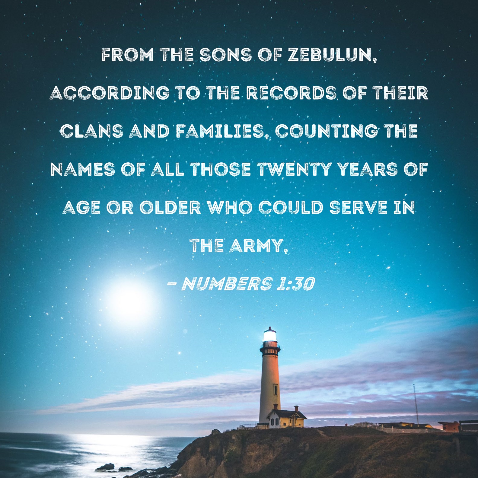 Numbers 1:30 From the sons of Zebulun, according to the records of their clans and families, counting the names of all those twenty years of age or older who could serve in the army,