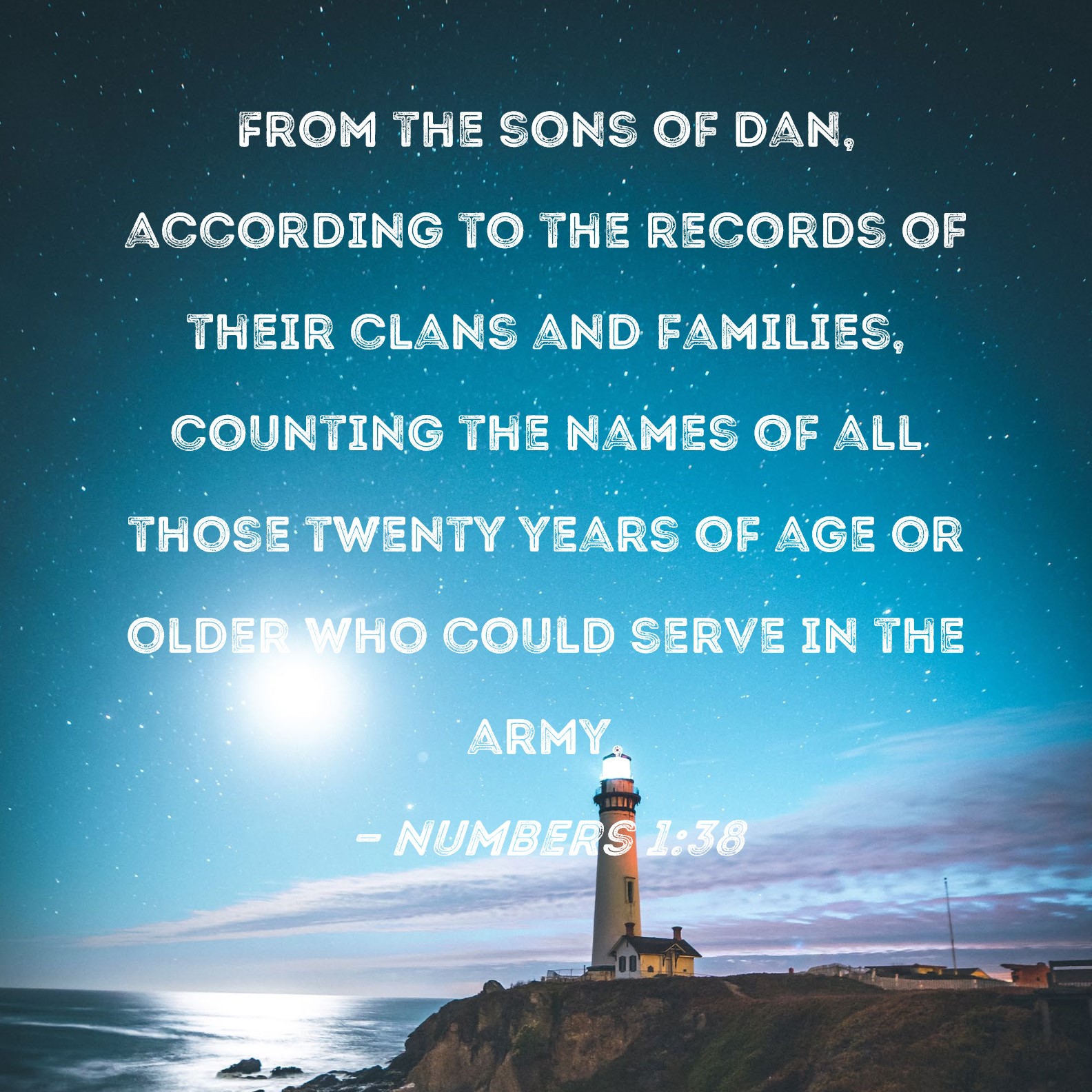 Numbers 1:38 From the sons of Dan, according to the records of their clans and families, counting the names of all those twenty years of age or older who could serve in the army,