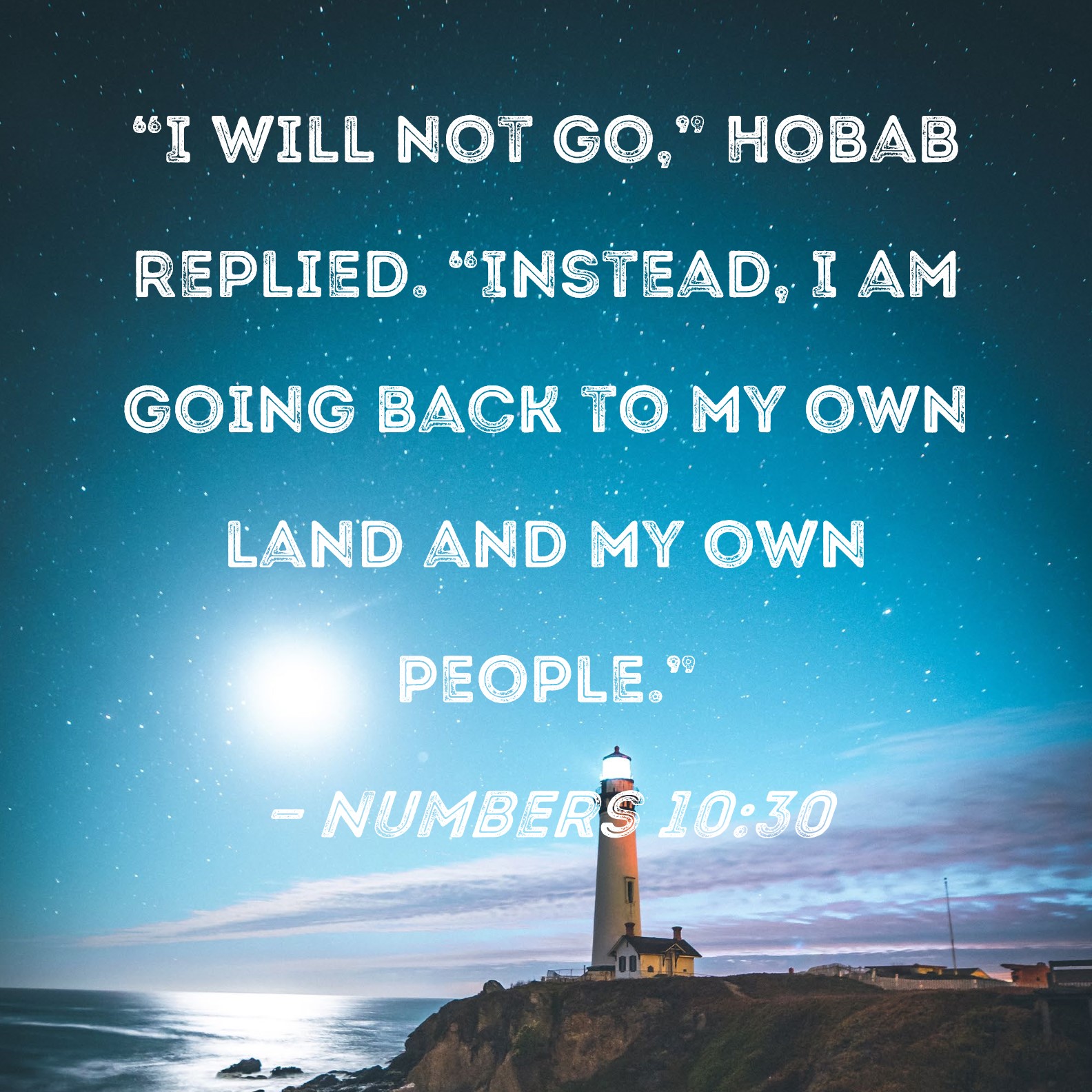 Numbers 10:30 "I will not go," Hobab replied. "Instead, I am going back to my own land and my own people."