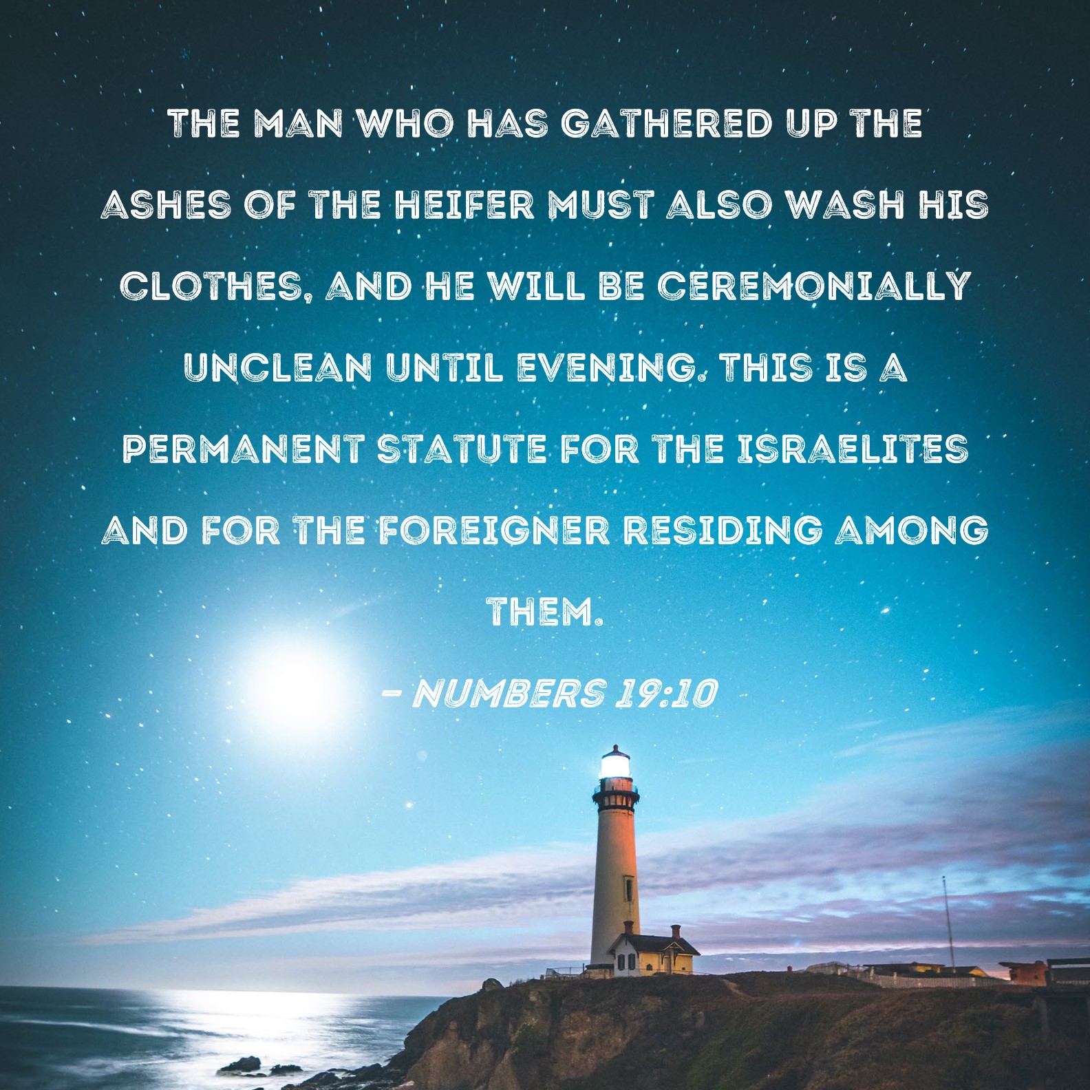 Numbers 19:10 The man who has gathered up the ashes of the heifer must also wash his clothes, and he will be ceremonially unclean until evening. This is a permanent statute for the Israelites and for the foreigner residing among them.