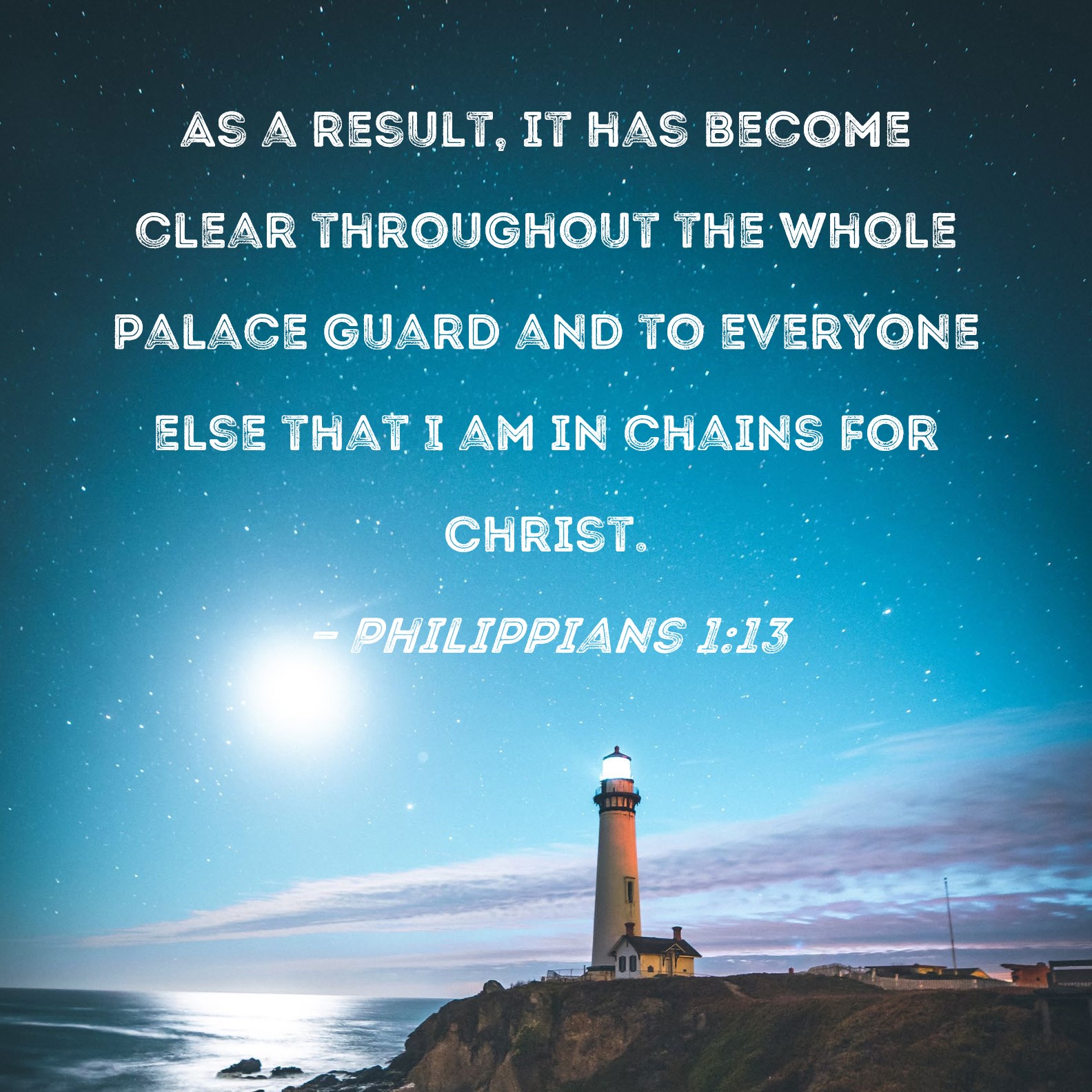 Philippians 1:13 As a result, it has become clear throughout the whole palace guard and to everyone else that I am in chains for Christ.