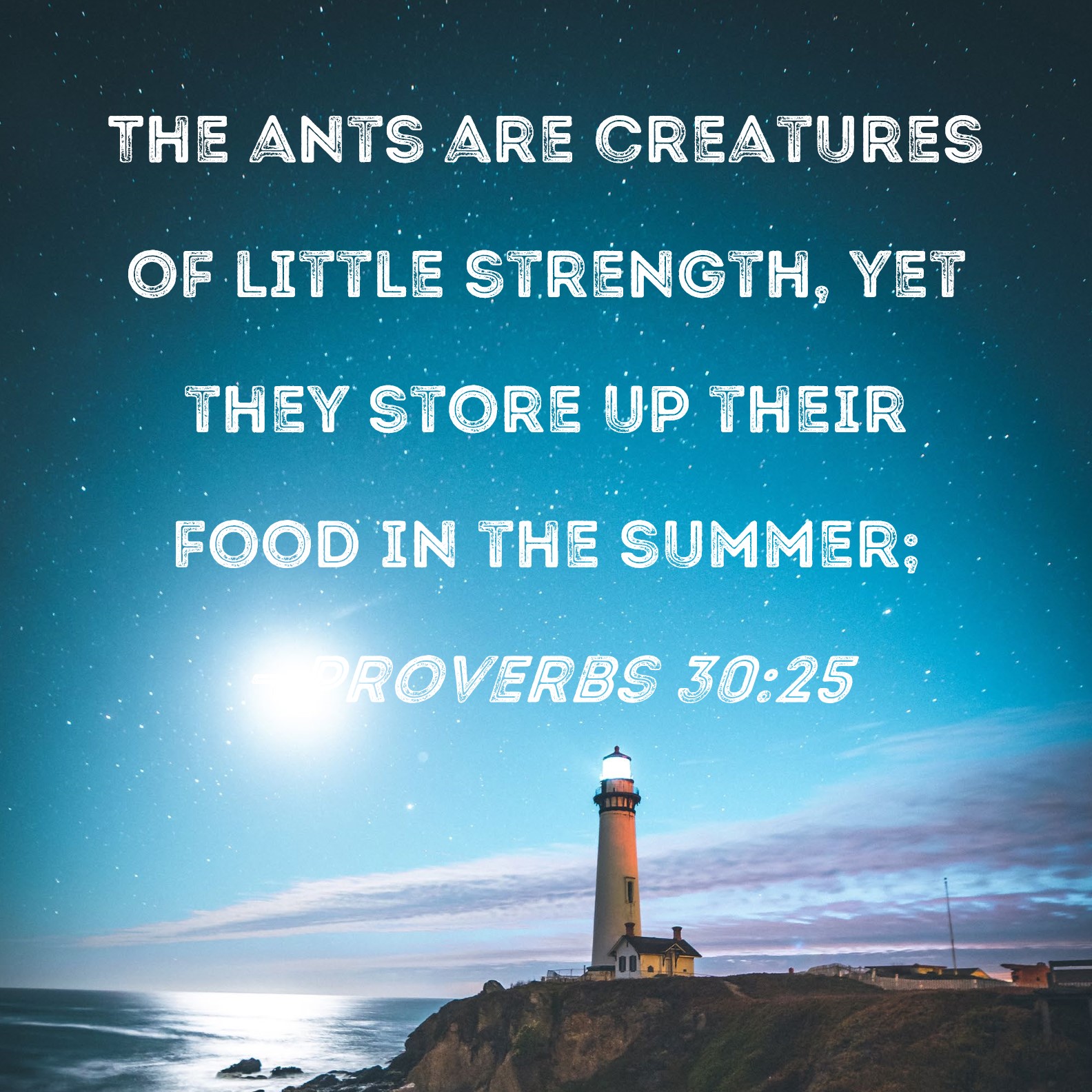 Proverbs 30:25 The ants are creatures of little strength, yet they store up their food in the summer;