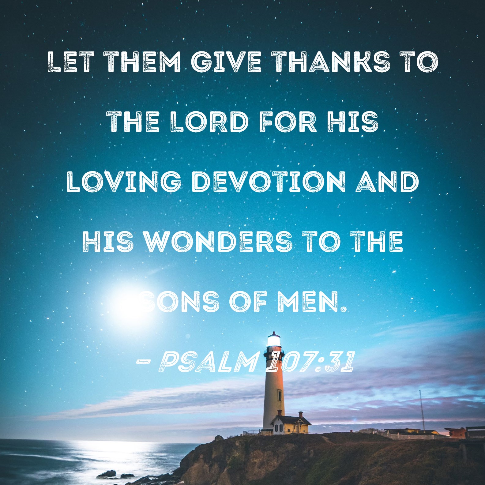 Psalm 107:31 Let them give thanks to the LORD for His loving devotion and His wonders to the sons of men.