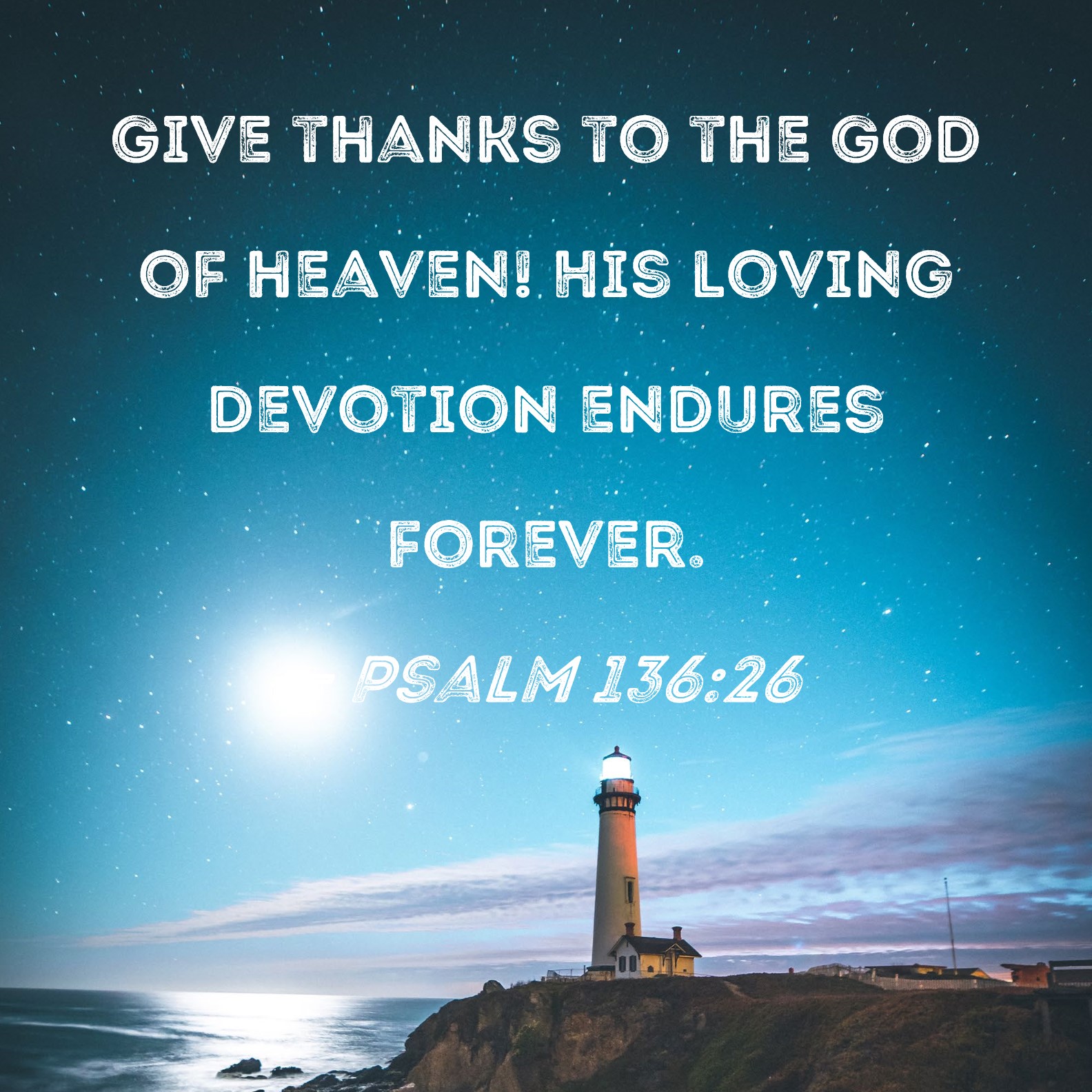 Psalm 136:26 Give thanks to the God of heaven! His loving devotion endures forever.