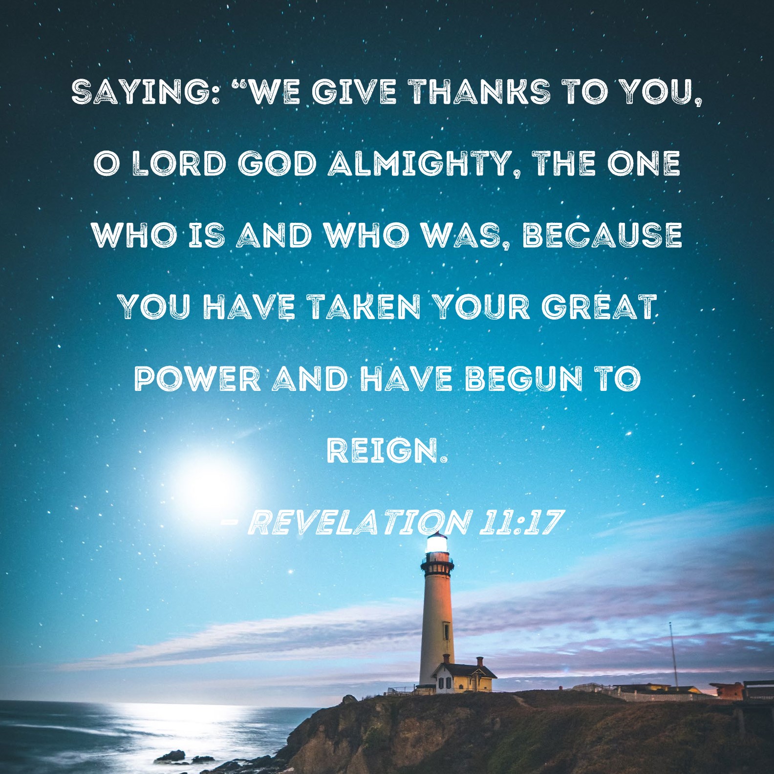 Revelation 11:17 saying: "We give thanks to You, O Lord God Almighty, the One who is and who was, because You have taken Your great power and have begun to reign.