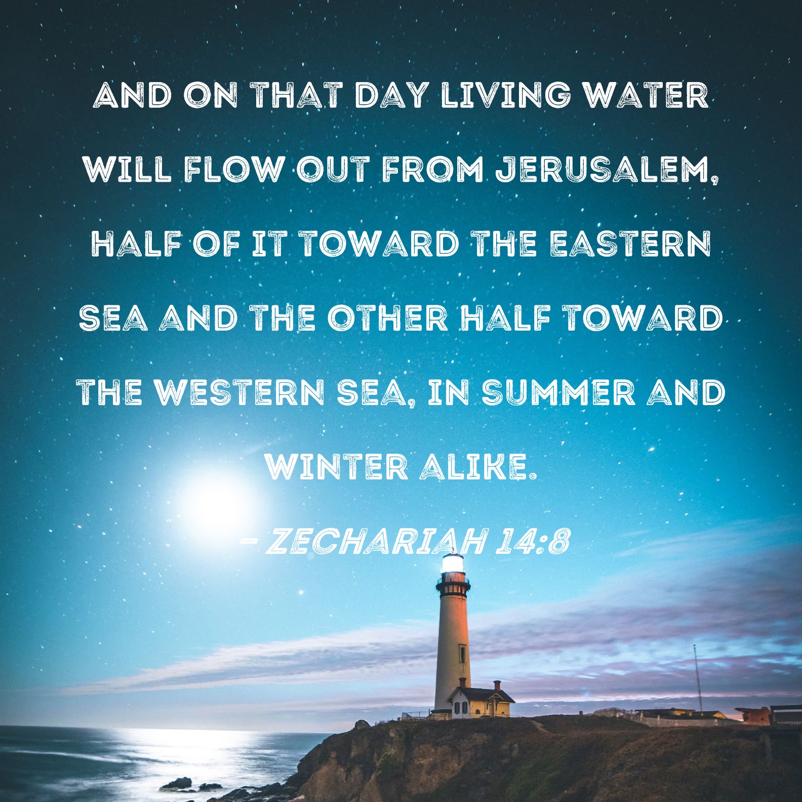 Zechariah 14:8 And on that day living water will flow out from Jerusalem, half of it toward the Eastern Sea and the other half toward the Western Sea, in summer and winter alike.
