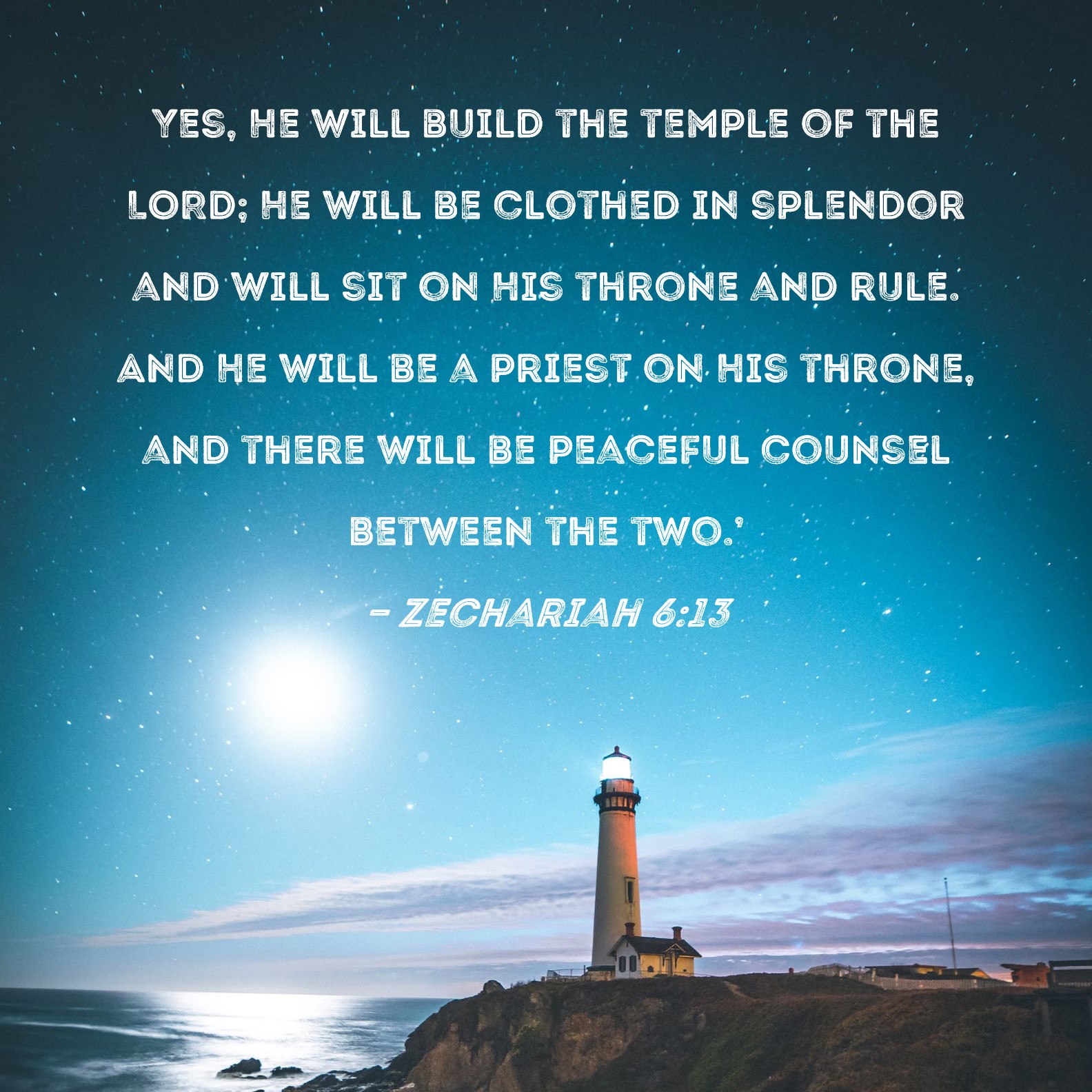 Zechariah 6:13 Yes, He will build the temple of the LORD; He will be clothed in splendor and will sit on His throne and rule. And He will be a priest on His throne, and there will be peaceful counsel between the two.'