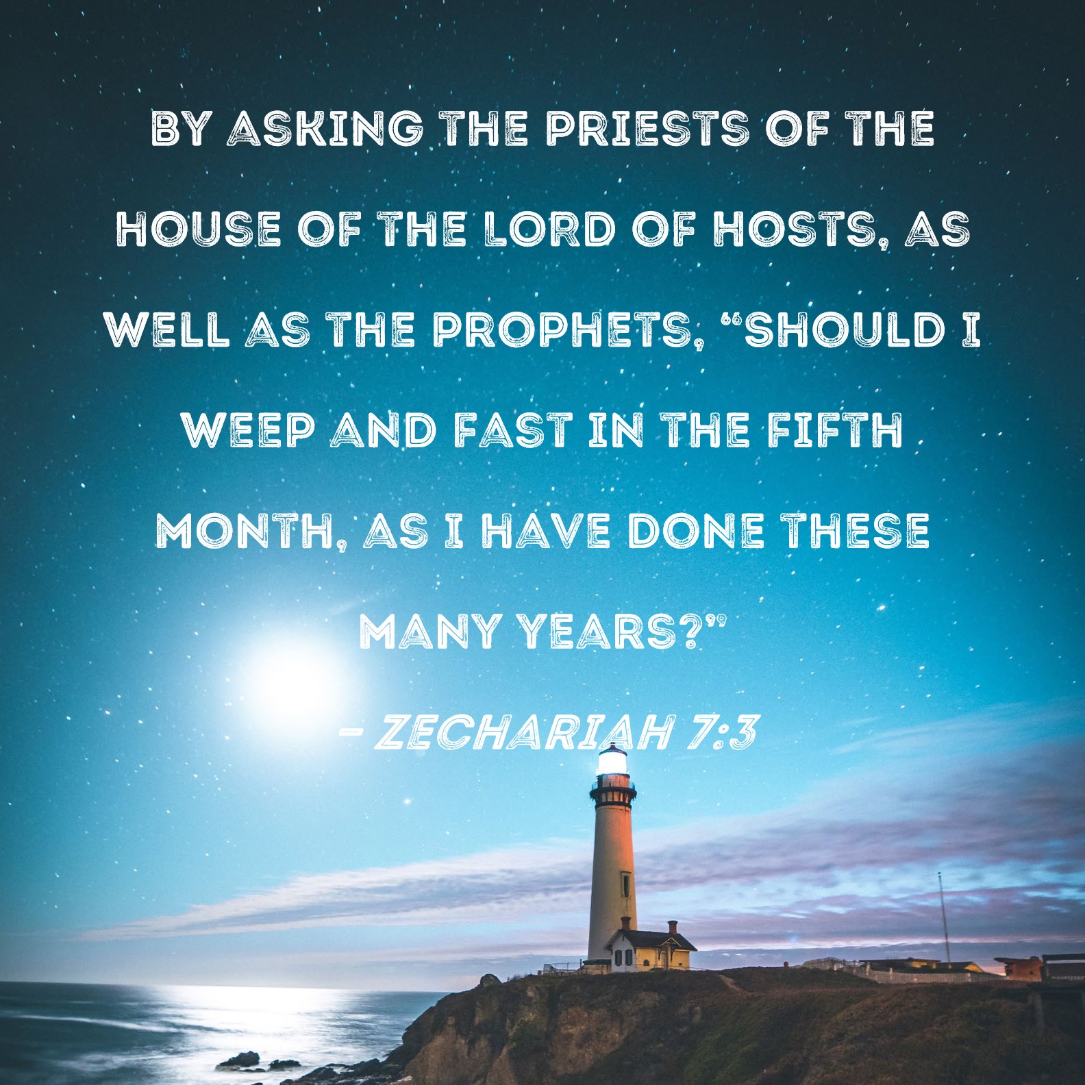 Zechariah 7:3 by asking the priests of the house of the LORD of Hosts, as well as the prophets, "Should I weep and fast in the fifth month, as I have done these many years?"