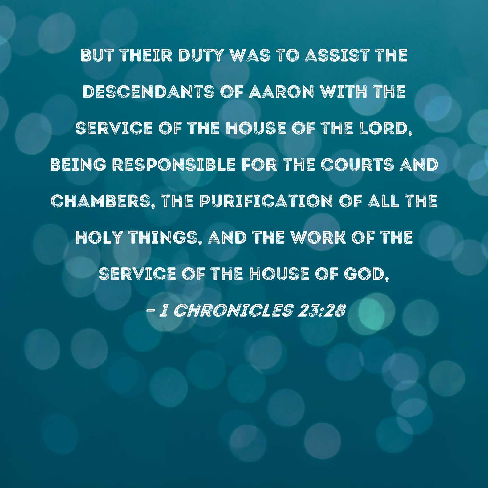 1 Chronicles 23:28 but their duty was to assist the descendants of Aaron with the service of the house of the LORD, being responsible for the courts and chambers, the purification of all the holy things, and the work of the service of the house of God,