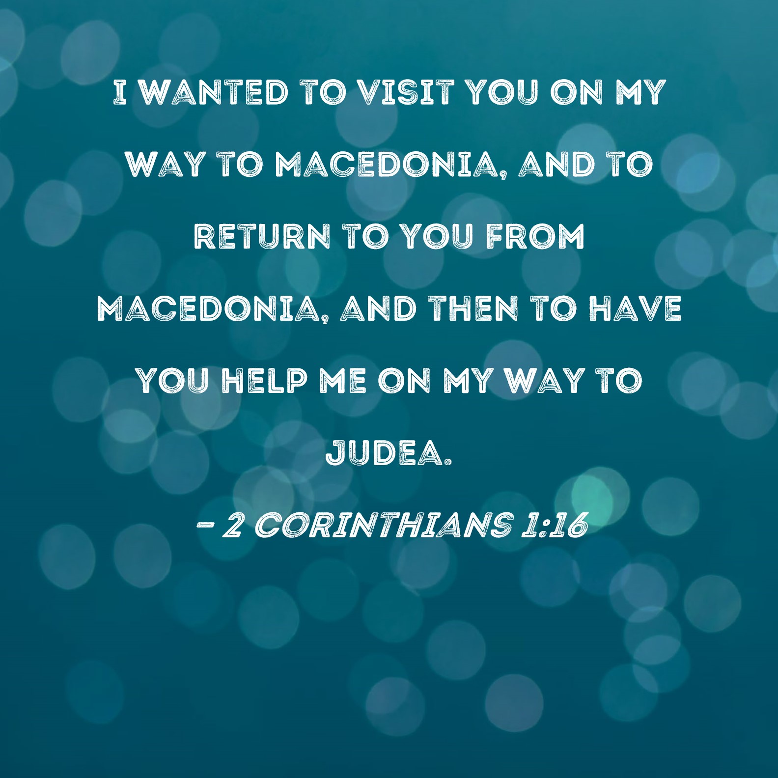 2 Corinthians 1:16 I wanted to visit you on my way to Macedonia, and to return to you from Macedonia, and then to have you help me on my way to Judea.