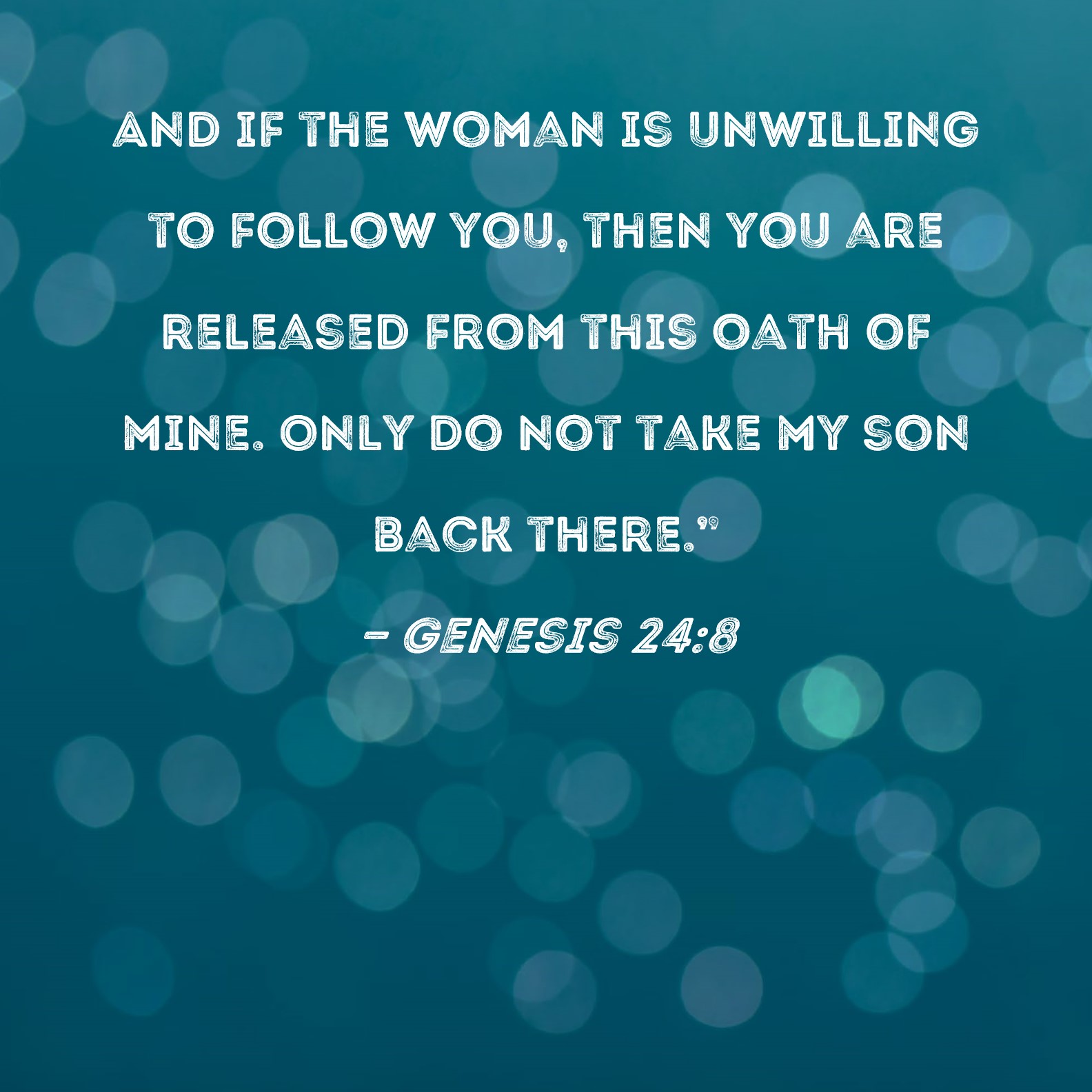 Genesis 24:8 And if the woman is unwilling to follow you, then you are released from this oath of mine. Only do not take my son back there."