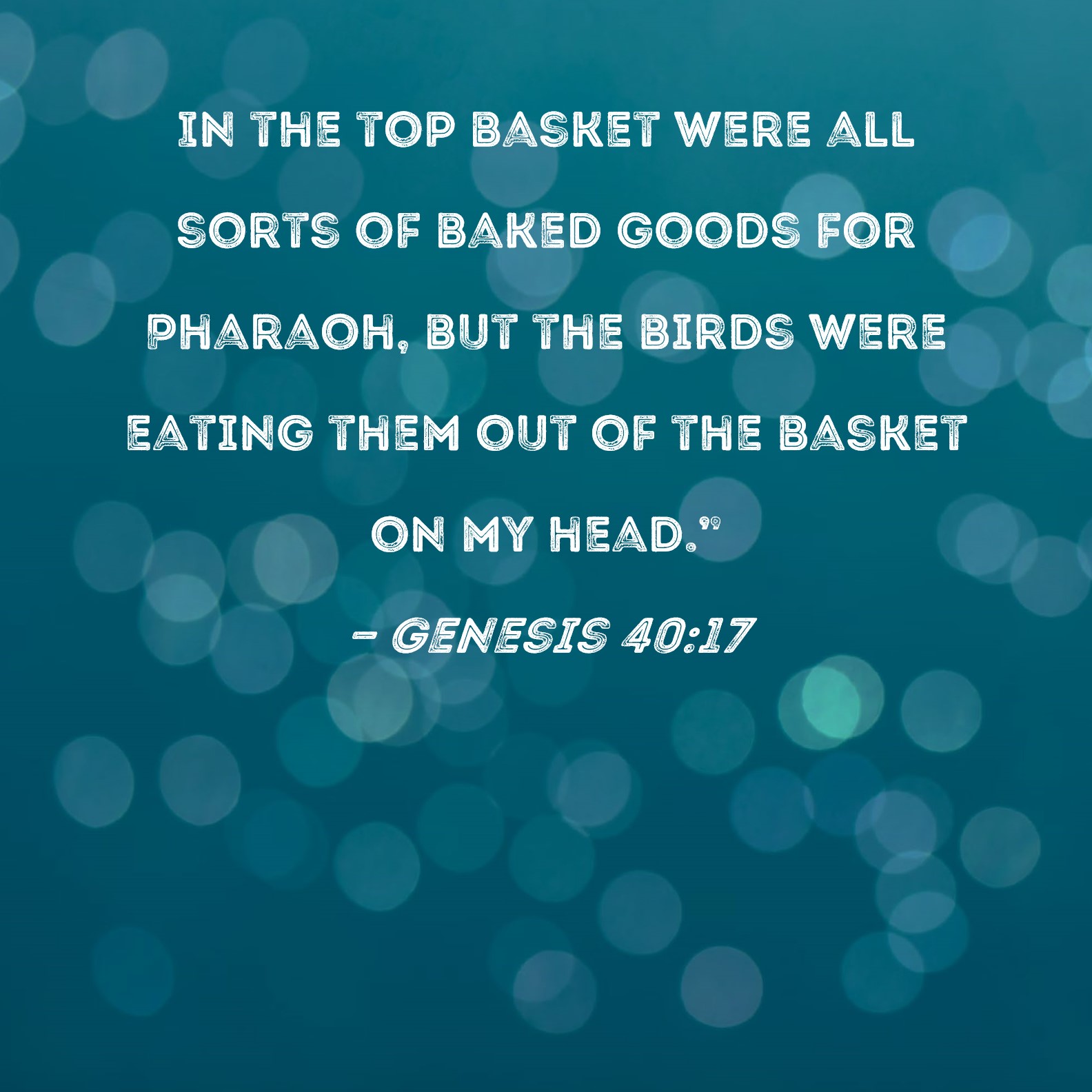 Genesis 40:17 In the top basket were all sorts of baked goods for Pharaoh, but the birds were eating them out of the basket on my head."