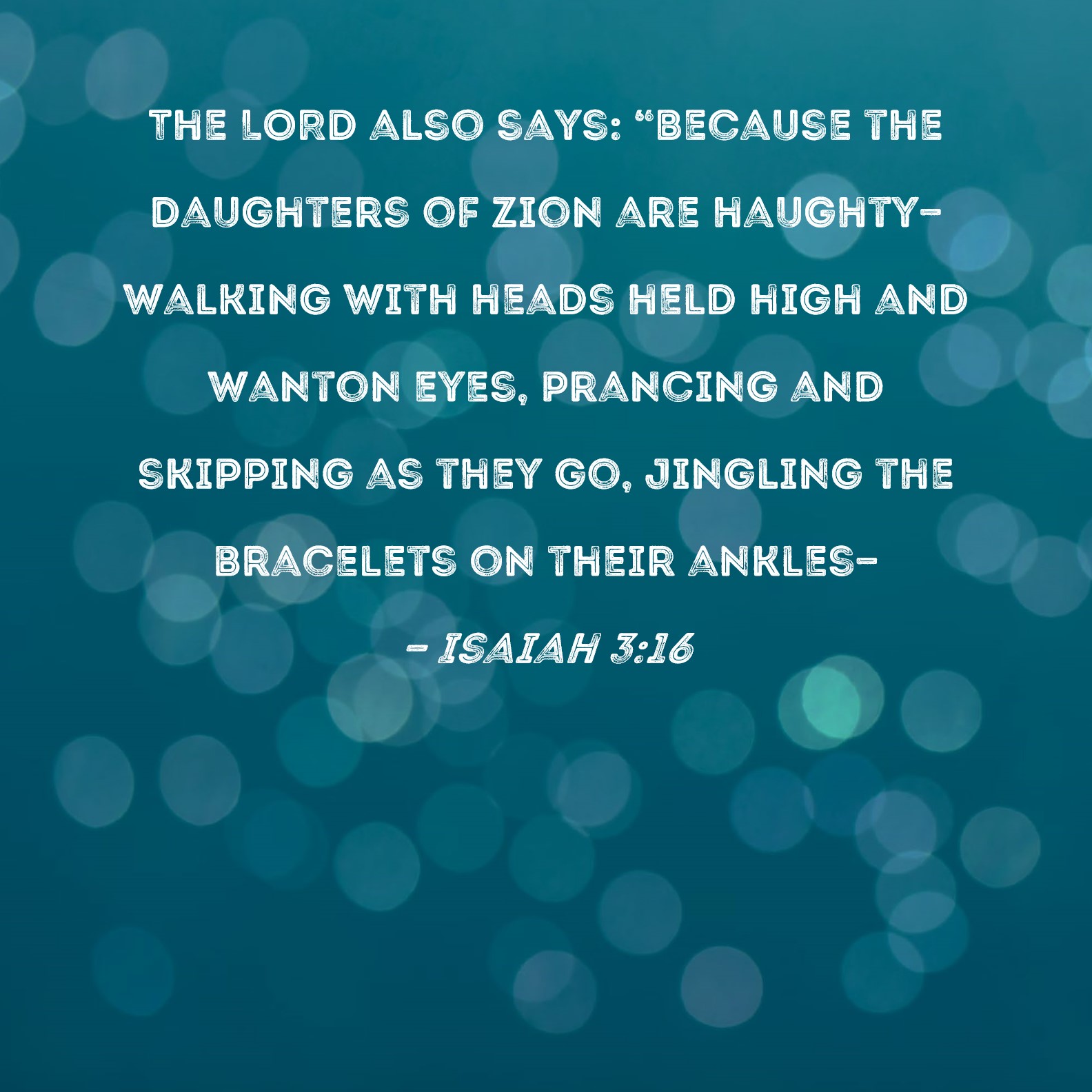 Isaiah 3:16 The LORD also says: "Because the daughters of Zion are haughty--walking with heads held high and wanton eyes, prancing and skipping as they go, jingling the bracelets on their ankles--