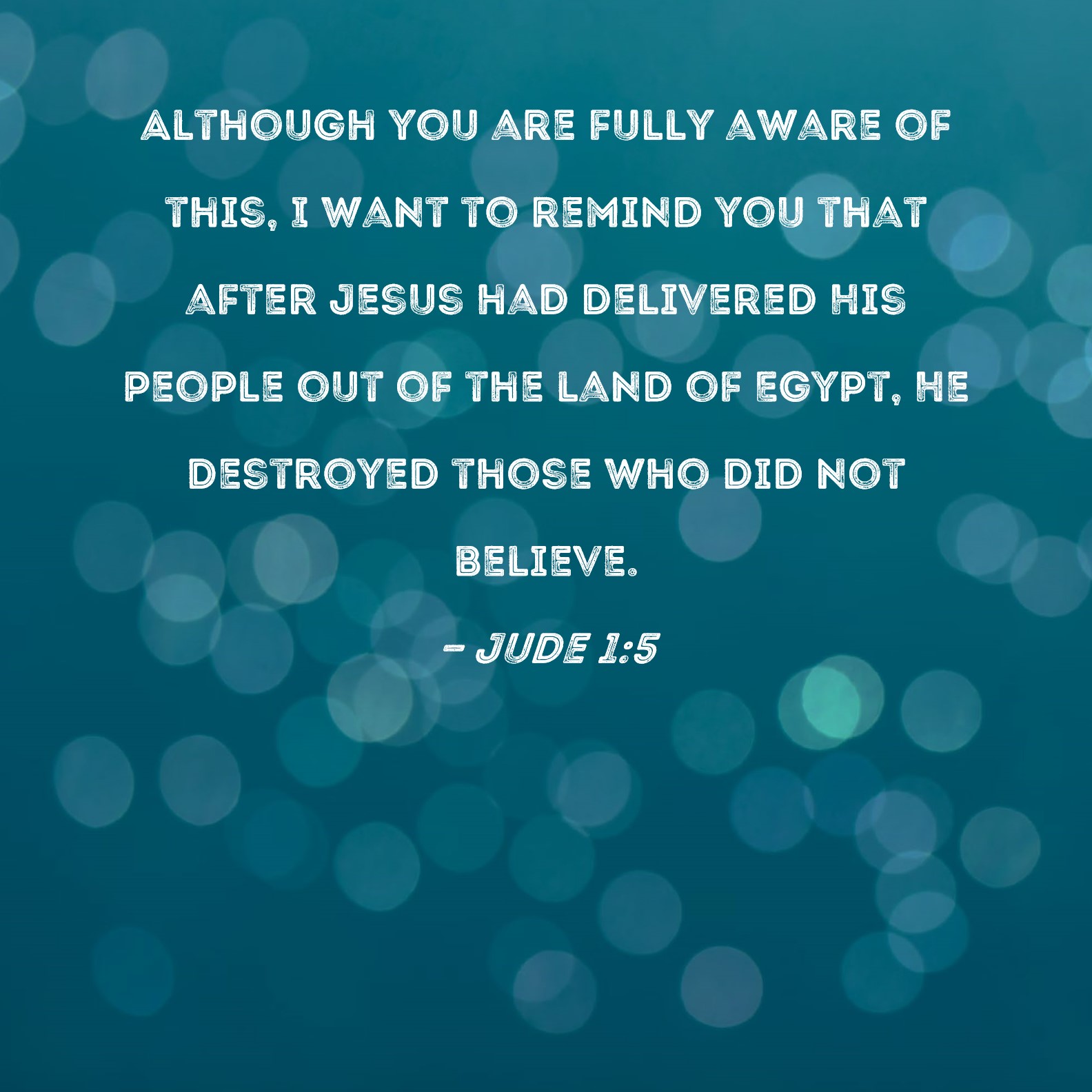 Jude 1:5 Although you are fully aware of this, I want to remind you that after Jesus had delivered His people out of the land of Egypt, He destroyed those who did not believe.