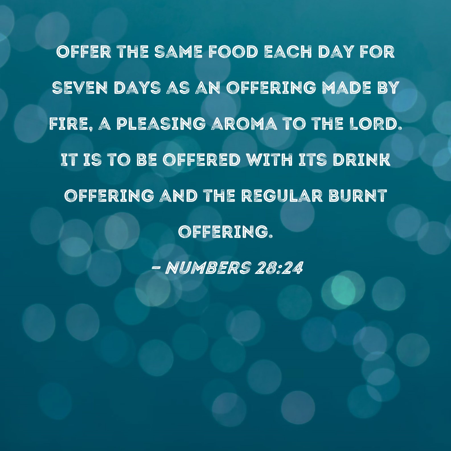 Numbers 28:24 Offer the same food each day for seven days as an offering made by fire, a pleasing aroma to the LORD. It is to be offered with its drink offering and the regular burnt offering.
