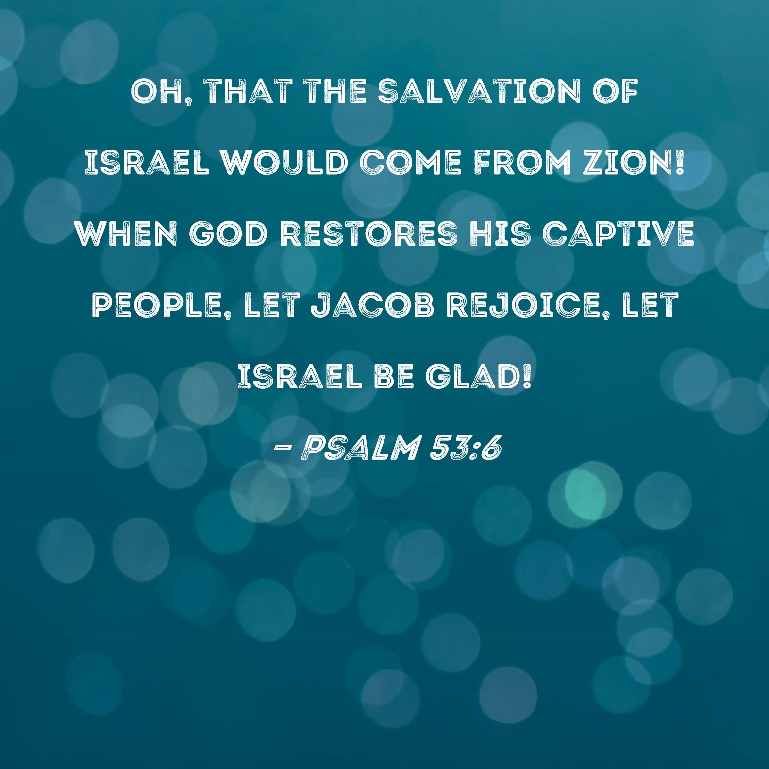 Psalm 53:6 Oh, that the salvation of Israel would come from Zion! When God restores His captive people, let Jacob rejoice, let Israel be glad!