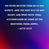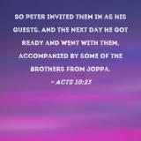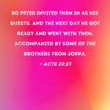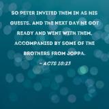 So Peter invited them in as his guests. And the next day he got ready and went with them, accompanied by some of the brothers from Joppa.