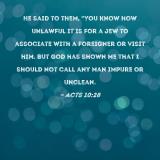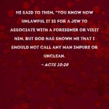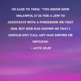 He said to them, "You know how unlawful it is for a Jew to associate with a foreigner or visit him. But God has shown me that I should not call any man impure or unclean.