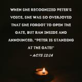 When she recognized Peter's voice, she was so overjoyed that she forgot to open the gate, but ran inside and announced, "Peter is standing at the gate!"