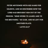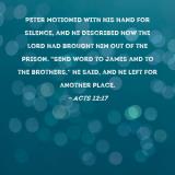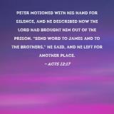 Peter motioned with his hand for silence, and he described how the Lord had brought him out of the prison. "Send word to James and to the brothers," he said, and he left for another place.