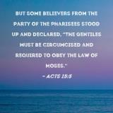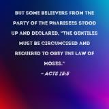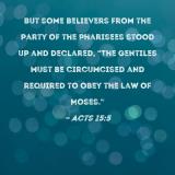 But some believers from the party of the Pharisees stood up and declared, "The Gentiles must be circumcised and required to obey the law of Moses."