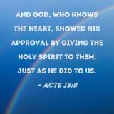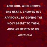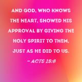 And God, who knows the heart, showed His approval by giving the Holy Spirit to them, just as He did to us.