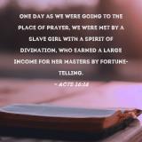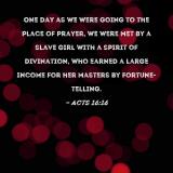 One day as we were going to the place of prayer, we were met by a slave girl with a spirit of divination, who earned a large income for her masters by fortune-telling.